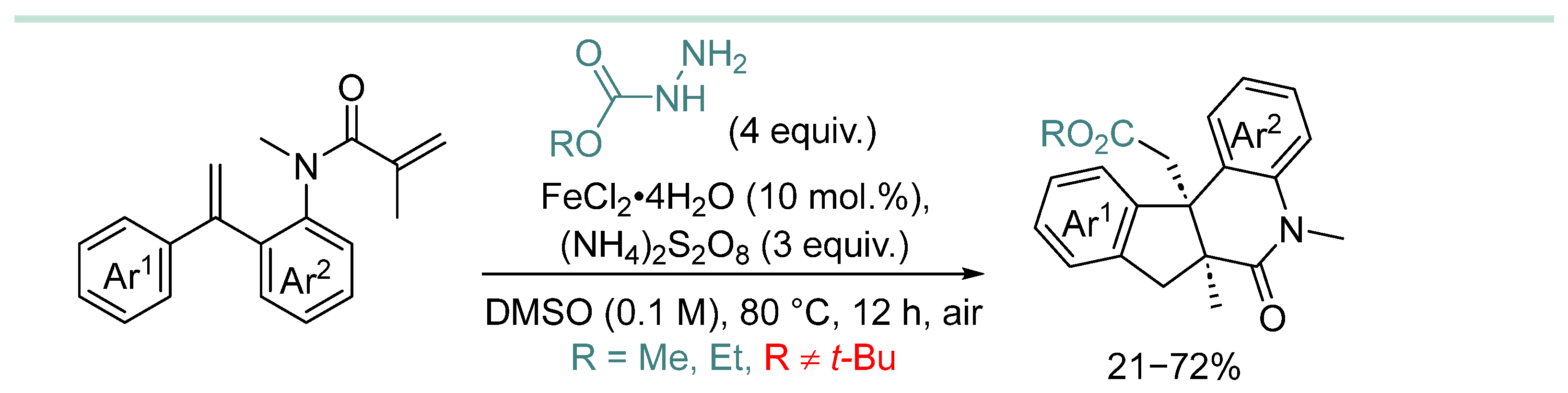 | 1 | CO2Me, CO2Et | HD (2 equiv.), FeCl2·4H2O (20 mol%), (NH4)2S2O8 (3 equiv.), DMSO (0.1 M), 55 °C, 6 h | [108] |