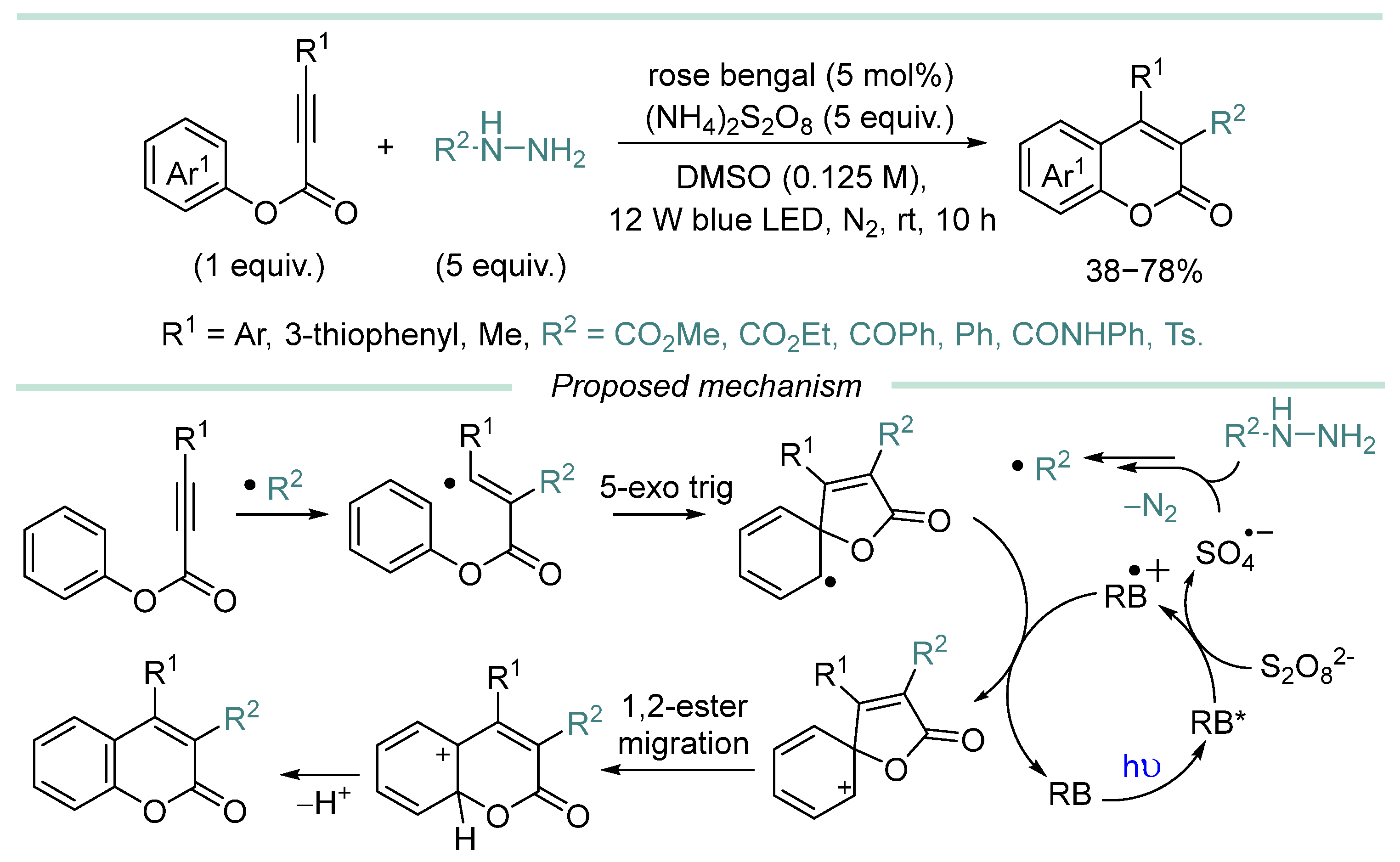 | 2 | CO2Me, CO2Et | HD (4 equiv.), rose bengal (5 mol%), Na2S2O8 (3 equiv.), DMSO (0.08 M), blue LED, rt, 6−12 h. | [109] |
