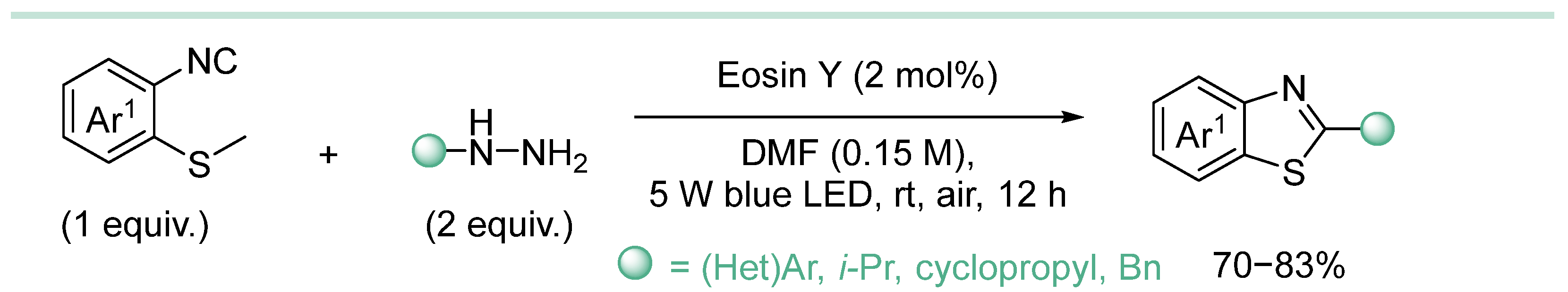 | 5 | (Het)Ar, c-Hex, i-Pr, | HD (2 equiv.), Eosin Y (5 mol%), KI (1.5 equiv.), K2CO3 (3 equiv.), EtOH/H2O (2/1, 0.07 M), 12W blue LED, rt, 10 h | [118] |