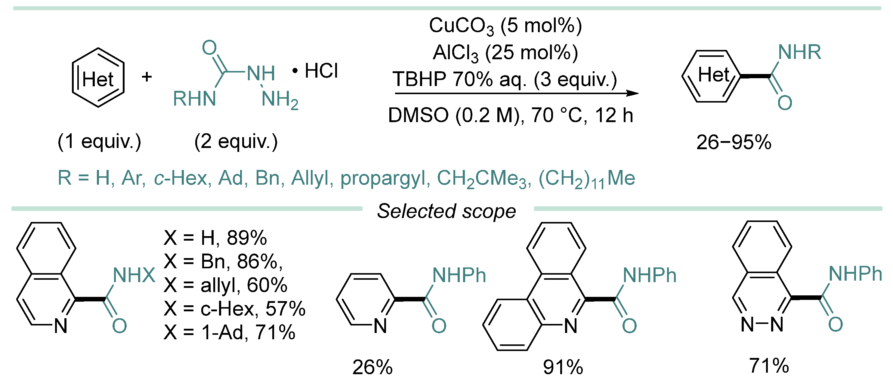 | 2 | CONHAr, CONH2, CONHAlk, CONHBn, CONHpropargyl. | HD (2 equiv.), CuCO3 (1 mol%), TBHP (4 equiv), DCE/MeCN (1:1, 0.3 M), 70 °C, N2, 4 h. | [67] |