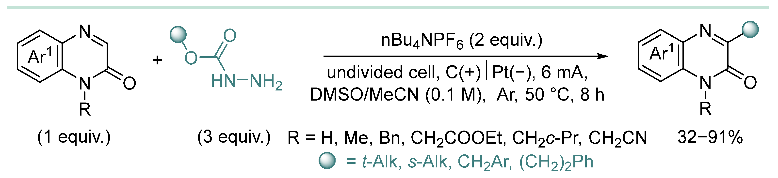 | 14 | Ar, 2-quinolinyl | HD (3 equiv), Quinuclidine (20 mol%), LiClO4 (1 equiv.), NaHCO3 (1 equiv.), MeCN (0.06 M), undivided cell, CCE I = 7 mA, 50 °C, Pt(+)|Ni(−), 7 h, 6.09 F/mol | [126] |