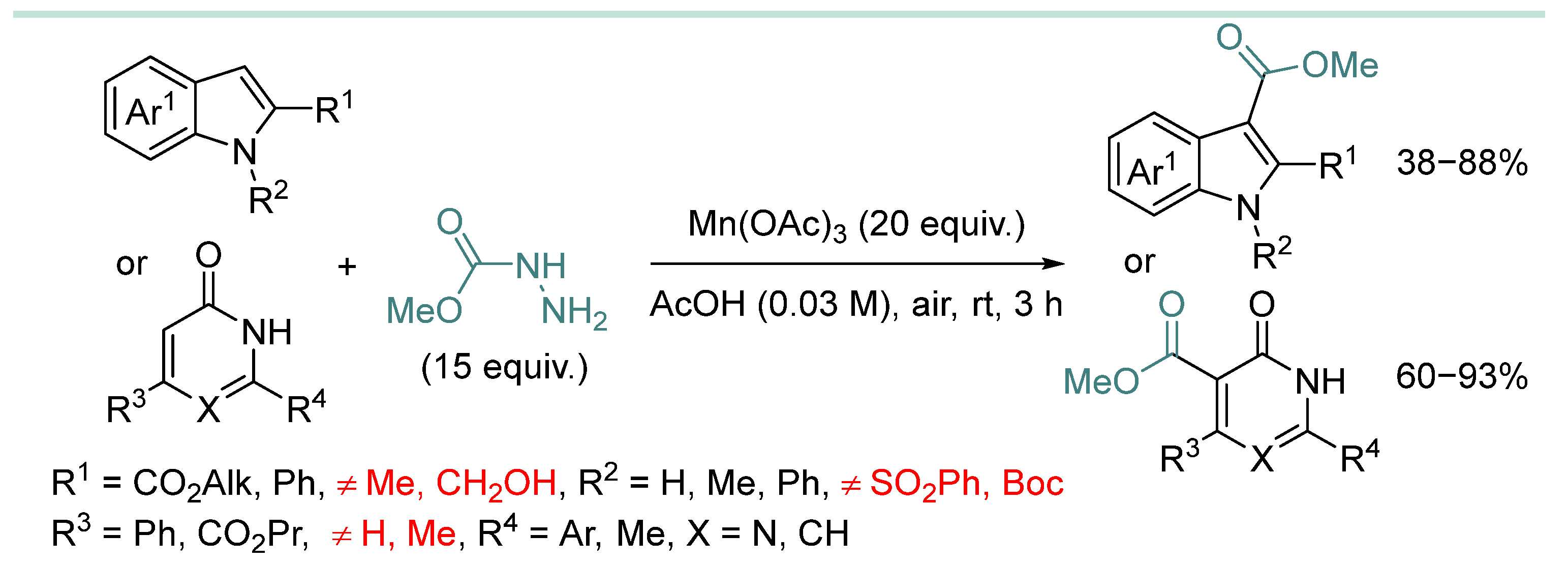 - Li, C.-K.; Zhang, D.-L.; Olamiji, O.; Zhang, P.-Z.; Shoberu, A.; Zou, J.-P.; Zhang, W. Mn(OAc)3-Mediated Regioselective Radical Alkoxycarbonylation of Indoles, Pyrimidinones, and Pyridinones. Synthesis 2018, 50, 2968–2973. [Google Scholar] [CrossRef]