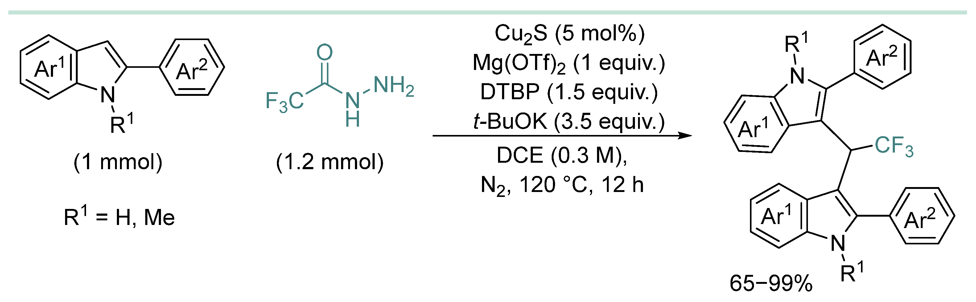 - Yuan, Z.; Chen, S.; Weng, Z. Copper-Catalyzed Synthesis of Trifluoromethylated Bis(Indolyl)Arylmethanes from 2-Arylindoles and 2,2,2-Trifluoroacetohydrazide. Org. Chem. Front. 2020, 7, 482–486. [Google Scholar] [CrossRef]
