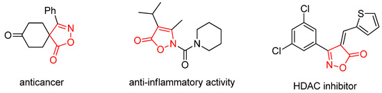 Isoxazolone and its derivatives represent an important class of five-membered heterocyclic compounds containing both nitrogen and oxygen atoms. They serve as crucial pharmacophores and structural motifs found in numerous natural products and pharmaceuticals [12,13,14]. The distinctive architecture of the isoxazolone ring enables it to engage in diverse non-covalent interactions, notably as a hydrogen-bond acceptor (via its N and O atoms), π-π stacking (through its unsaturated ring system), and hydrophilic interactions. This capacity to interact with various protein targets underpins the broad spectrum of biological activities exhibited by isoxazolone-based compounds, leading to their widespread application in medicinal and agrochemical fields. A multitude of both natural and synthetic isoxazolone derivatives have been investigated as active agents for various therapeutic purposes, including anticancer, anti-inflammatory, antidiabetic, and antiviral applications (Figure 1) [15,16,17]. In addition, incorporating a trifluoromethyl group serves as a strategic medicinal chemistry tactic to simultaneously enhance key pharmacological properties. Its strong electron-withdrawing effect and high lipophilicity improve metabolic stability, membrane permeability, and target binding affinity, while its role as a versatile bioisostere allows for the fine-tuning of molecular interactions, a principle validated by numerous successful therapeutics [18,19,20,21].
