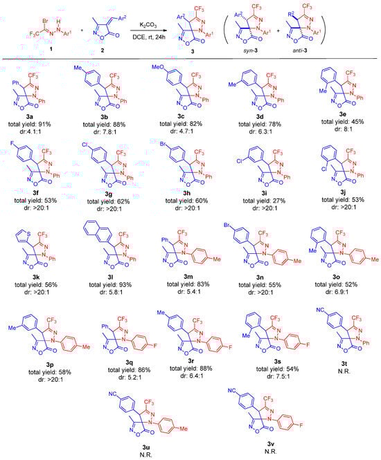 Substrate scope of arylidene isoxazol-5(4H)-one 1 and trifluoroacetyl bromohydrazone 2. Unless noted otherwise, the reactions were carried out with 1 (0.48 mmol), 2 (0.40 mmol), and K2CO3 (0.48 mmol) in DCE (2.0 mL) at rt for 24 h. The yields were isolated after column chromatography. Diastereomeric ratio was determined by 1H NMR analysis of the crude reaction mixture.