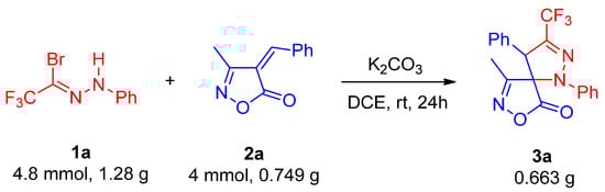 To a solution of K2CO3 (0.4 mmol) in 1,2-dichloroethane (2 mL) was added trifluoromethyl bromohydrazone 1 (0.48 mmol, 1.2 equiv) and unsaturated isoxazolone derivative 2 (0.4 mmol, 1.0 equiv). The reaction mixture was stirred at room temperature for 24 h. Upon completion, the solvent was removed under reduced pressure, and the residue was purified by flash chromatography on silica gel (eluent: petroleum ether/ethyl acetate = 20:1, v/v) to afford product 3.