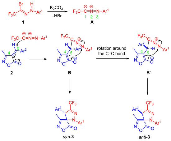A plausible reaction mechanism consistent with these observations is proposed in Scheme 4. The reaction commences with K2CO3-promoted dehydrobromination of bromohydrazone 1 to generate nitrile imine intermediate A in situ. Regioselective [3+2] cycloaddition of A onto the (Z)-configured unsaturated isoxazolone 2 affords zwitterionic intermediate B. Rotation around the newly formed anionic C–C single bond in B can produce rotamer B′, differing in the spatial arrangement of the substituents. Subsequent intramolecular nucleophilic attack of the C4 enolate on the iminium nitrogen (N3) then yields the syn-diastereomer syn-3 predominantly from B, while the minor anti-diastereomer anti-3 is generated from B′.