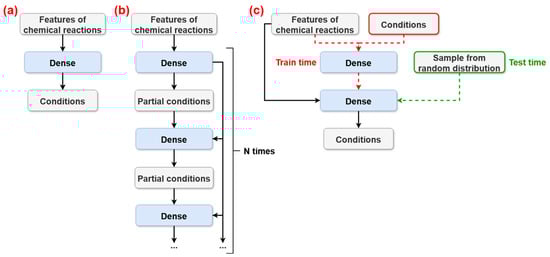 Schematic illustration of the high-level architectures of the following models compared in the article: (a)—LRM proposed by Afonina V.A. et al. [10]; (b)—Model from ASKCOS proposed by Gao et al. [6]; and (c)—our CVAE-based model. “Dense” represents one or more dense layers of neural networks. “Partial conditions” is the output layer containing only certain condition components (e.g., only catalyst or temperature). Only the CVAE architecture incorporates the RCs as an input during training (red dashed lines), enabling learning of a latent distribution over feasible reaction conditions. During inference, these inputs are replaced by random samples drawn from a prior random distribution (green dashed lines), allowing the model to generate multiple possible condition combinations.