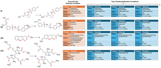 The 10 most frequent conditions in the training set are shown in the Supplementary Materials (Figures S1 and S2), and the complete list of catalysts and additives corresponding to the condition vector is available in the Supplementary Materials (Table S4). In predicted conditions, only 1 bit corresponding to temperature and pressure can be selected, while any combination of catalysts and additives is allowed, which gives rise to astronomic condition space reaching 7 × 1042 potential conditions.