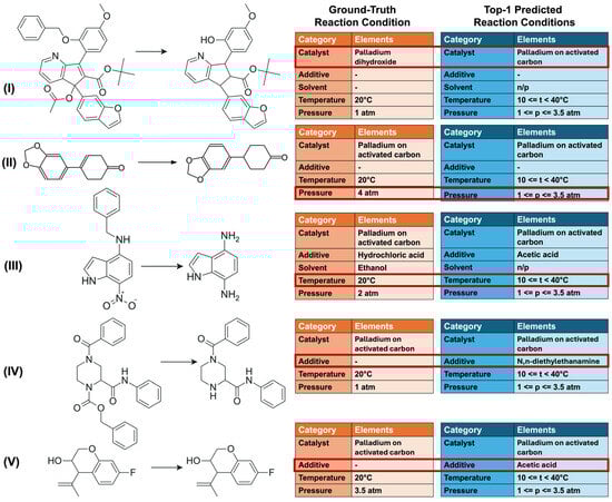 In conclusion, we performed a qualitative analysis of top-1 predictions in cases where the h-CVAE model correctly identified the combination of RCs, except for one condition component. Specifically, the model accurately predicted temperature and pressure ranges but proposed a different catalyst (see Figure 5, reaction I). A more detailed analysis of such cases (see Supplementary Materials, Table S2) demonstrated that the proposed catalyst typically belonged to the same active transition metal as the ground truth catalyst, while differing in its support, ligand environment, or oxidation state. This analysis illustrates that the model tends to remain within a chemically related region of the condition space. For example, in reaction I (Figure 5), the h-CVAE recommended palladium on activated carbon at top-1, whereas the ground truth conditions specified palladium dihydroxide; notably, the latter was ranked as top-2 by the model (see Supplementary Materials, Table S2). Likewise, deviations in the predicted temperature or pressure usually corresponded to neighboring ranges rather than entirely different ranges (see Figure 5, reactions II and III). In some cases, the h-CVAE correctly predicted all reaction conditions but additionally suggested the presence of an acid or base, although the reported experimental RCs did not require such additives (see Figure 5, reactions IV and V). It is not possible to objectively determine the practical feasibility or optimality of non-matching predicted conditions without experimental validation. Therefore, the analysis of such predictions is limited to a qualitative assessment of model behavior in the condition space. Experimental verification remains a necessary step beyond the scope of this work.
