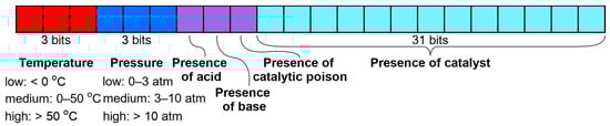 The condition vector for dataset S contained 40 bits, as described in the publication [17]—3 bits for temperature and pressure (low, medium, and high), 3 bits encoding the presence of additives (acid, base, and catalytic poison), and 31 bits for used catalysts (Figure 6). Only catalysts used in more than 100 reactions in the training set were considered. The complete list of catalysts and the definition of the temperature and pressure values range can be found in the Supplementary Materials, Table S3. The 10 most frequently occurring conditions are displayed in the Supplementary Materials (Figure S3). A combination of 1 bit out of 3 selected for temperature and pressure, 1 selected catalyst, and all possible selections of additives gives rise to 2232 possible conditions.