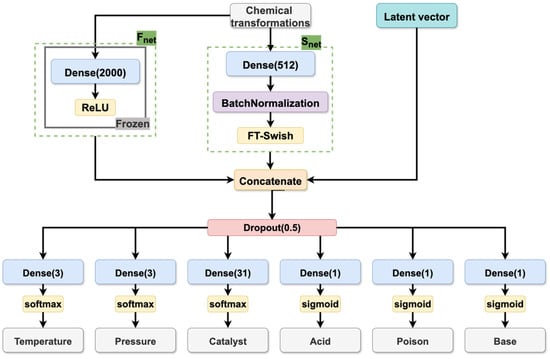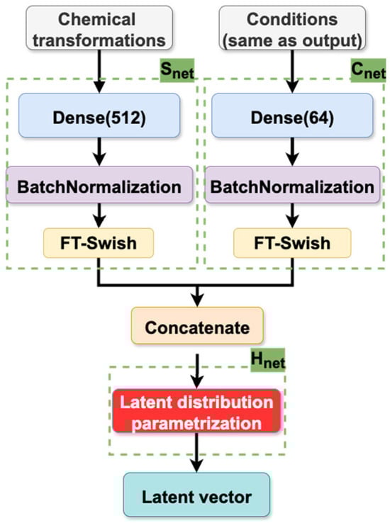 Model architecture. The architecture of the CVAE model is composed of two primary components: the encoder and the decoder. The function of the encoder is to map input reaction conditions and chemical transformation descriptors into the latent space, while the decoder is responsible for the reconstruction of conditions by sampling from this distribution. The architectural details of the encoder and decoder are illustrated in Figure 9, Figure 10 and Figure 11, which have been specifically designed for reaction condition prediction for datasets S and B, respectively.