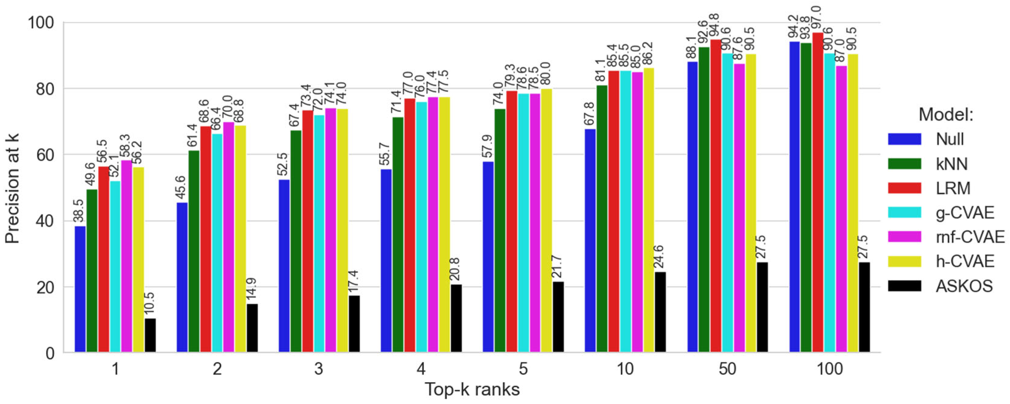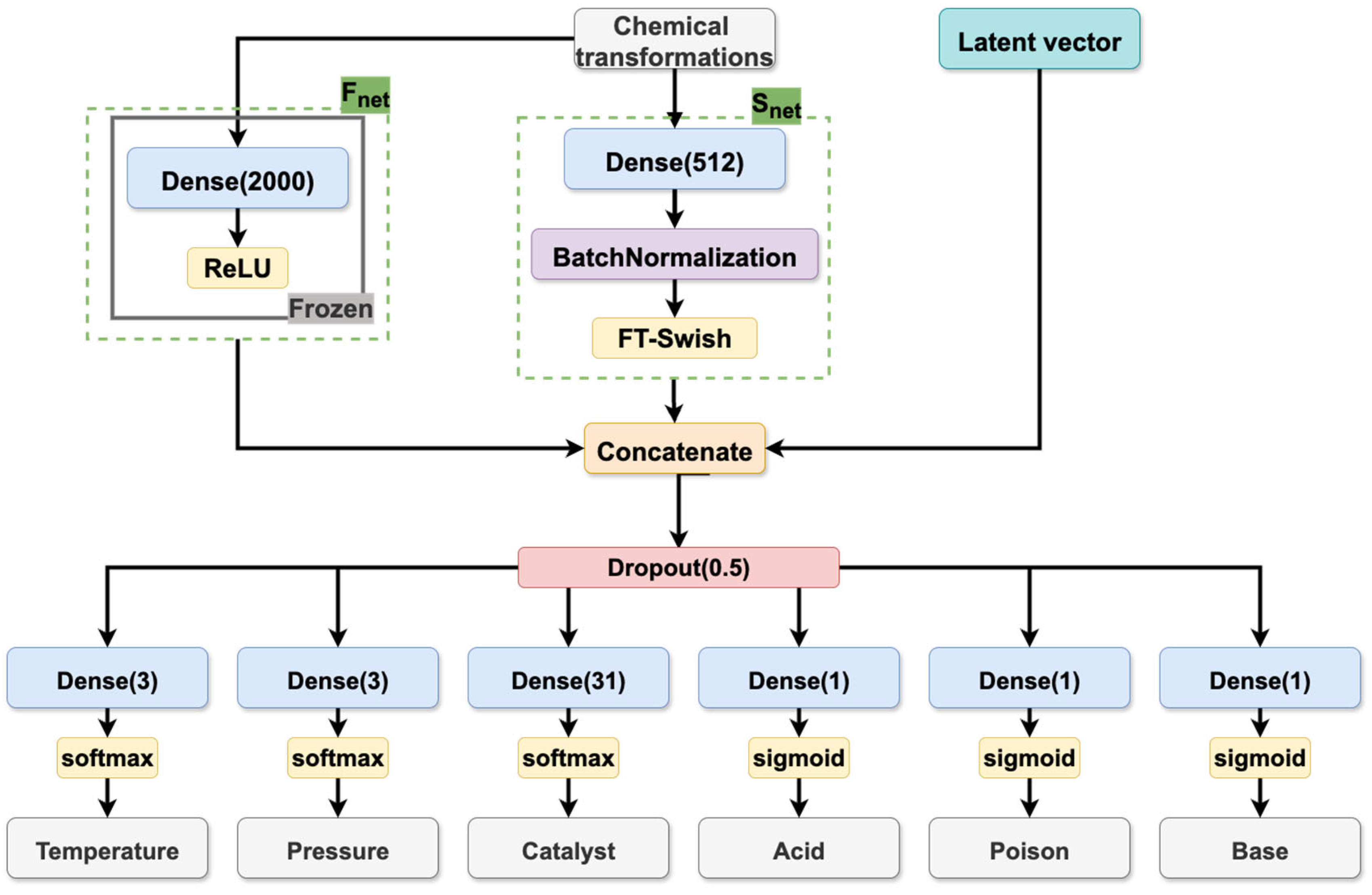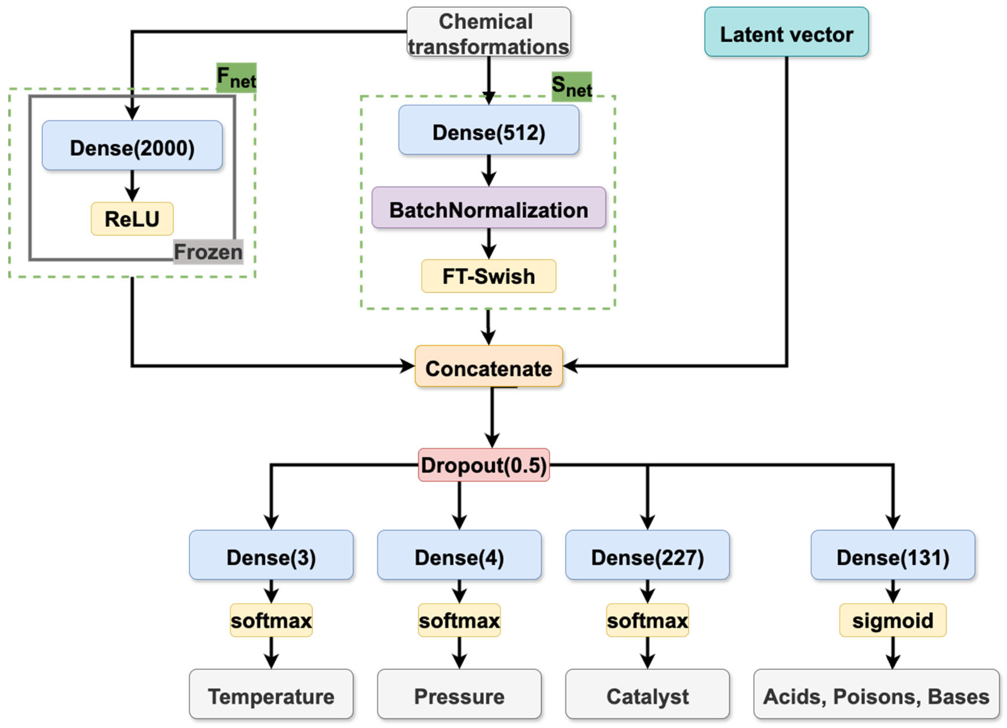 - A Likelihood Ranking Model (LRM) [10] applies to a feed-forward neural network with a single hidden layer of 2000 neurons and a ReLU activation function to predict reaction conditions. The output layer has sigmoid activation and predicts each condition component’s probabilities and ranks them according to likelihood [10].