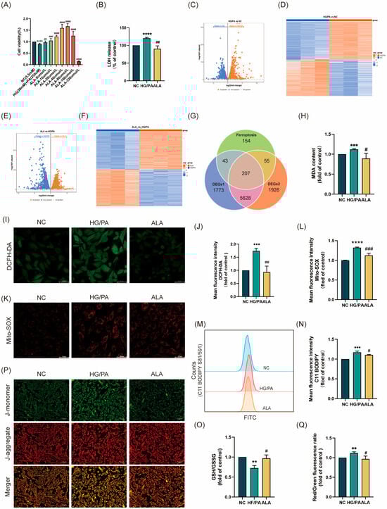 α-linolenic acid (ALA) attenuated HG/PA-induced ferroptosis in H9C2 cells. (A) Cell viability of HG/PA-injured H9C2 cells treated with different concentrations of ALA was determined by CCK-8 assay (n = 3). (B) LDH release in the culture medium (n = 3). (C,D) Volcano plot and heatmap showing differences between NC and HG/PA groups. (E,F) Volcano plot and heatmap differences between NC and HG/PA groups. (G) Venn diagram presenting the intersection between DEGs and ferroptosis regulators. (H) Measurement of malondialdehyde (MDA) levels (n = 3). (I,J) Representative images (scale bar = 50 μm, n = 3) and quantitative analysis of DCFH-DA staining for total intracellular ROS. (K,L) Representative images (scale bar = 50 μm, n = 3) and quantitative analysis of Mito-SOX staining for mitochondrial ROS. (M,N) Flow cytometry analysis of lipid peroxidation levels using C11-BODIPY 581/591 probe (n = 3). (O) Quantitative determination of intracellular GSH/GSSG ratio (n = 3). (P,Q) Representative images (scale bar = 100 μm, n = 3) and quantitative analysis of JC-1 staining (red: JC-1 aggregates; green: JC-1 monomers), reflecting mitochondrial membrane potential (ΔΨm) (n = 3). All results are presented as mean ± SD. # p < 0.05, **/## p < 0.01, ***/### p < 0.001, and ****/#### p < 0.0001 vs. the control group.