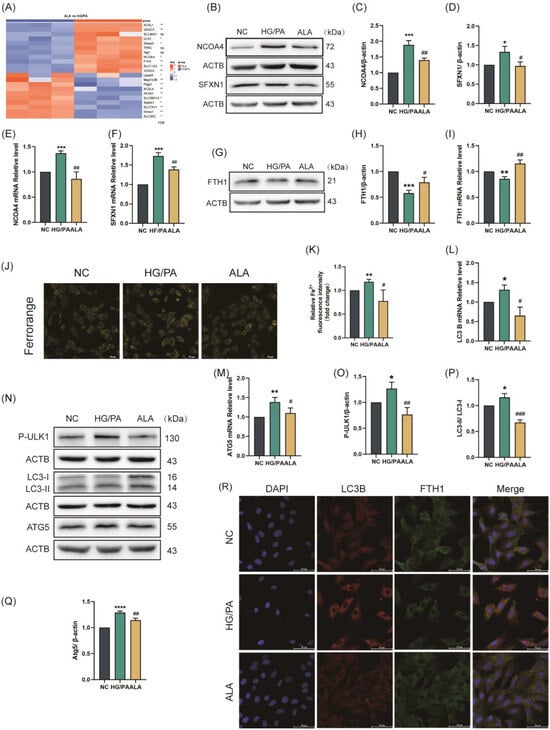 α-Linolenic acid (ALA) alleviated HG/PA-induced ferritinophagy in H9C2 cells. (A) Heatmap of significantly regulated genes associated with ferroptosis in ALA groups vs. HG/PA groups (n = 3). (B–D) Representative Western blot (B) and quantification analysis (C,D) of NCOA4 and SFXN1 protein levels in H9C2 (n = 3). (E,F) Relative mRNA levels of ferroptosis-related genes NCOA4 (E) and SFXN1 (F) detected by RT-qPCR (n = 3). (G,H) Representative Western blot (G) and quantitative analysis (H) of FTH1 protein expression (n = 3). (I) Relative mRNA level of ferroptosis-related gene FTH1 detected by RT-qPCR (n = 3). (J,K) Representative fluorescence images ((J), scale bar = 50 μm, n = 3) and quantitative analysis of fluorescence intensity (K) of intracellular Fe2+ in H9C2 cells (FerroOrange staining). (L,M) Relative mRNA levels of autophagy/ferroptosis-related genes LC3B (L) and ATG5 (M) detected by RT-qPCR (n = 3). (N–Q) Representative Western blot (N) and quantitative analysis (O–Q) of p-ULK1, LC3B, and ATG5 protein expression ((O): p-ULK1; (P): LC3B; (Q): ATG5, n = 3). (R) Immunofluorescence images showing colocalization of endogenous FTH1 (green) and LC3B (red) in H9C2 cells (scale bar = 50 μm); Nuclei were stained with DAPI (blue). Data are presented as means ± SDs from three independent experiments. */# p < 0.05, **/## p < 0.01, ***/### p < 0.001, and **** p < 0.0001, ns p > 0.05 vs. the indicated group.