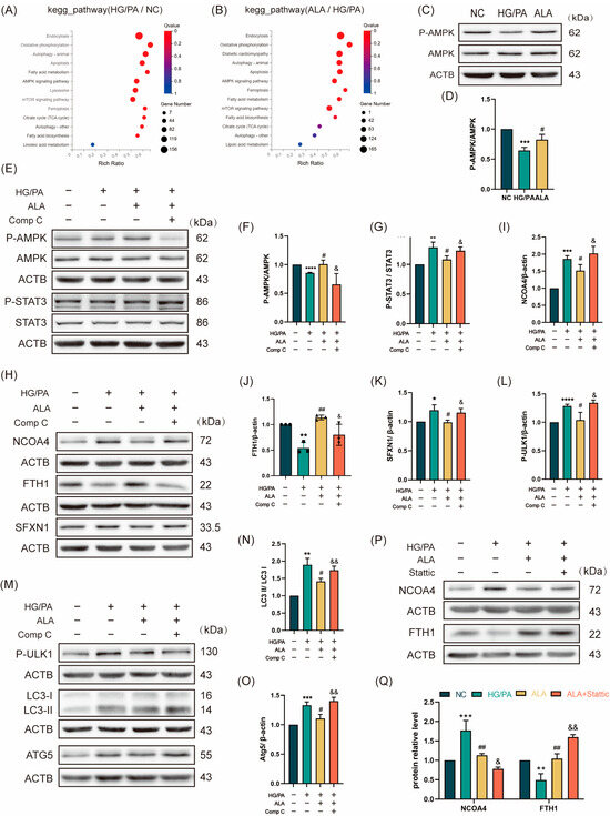 α-Linolenic acid (ALA) ameliorates HG/PA-induced ferritinophagy in H9C2 cells by activating the AMPK signaling pathway. (A) KEGG enrichment bubble plot comparing the NC group versus the HG/PA group (n = 3). (B) KEGG enrichment bubble plot comparing the ALA treatment group versus the HG/PA group (n = 3). (C,D) Representative Western blot and quantitative analysis of p-AMPK and AMPK protein expression in H9C2 cells (n = 3). (E–G) Representative Western blot (E) and quantification analysis (F,G) of p-AMPK, AMPK, p-STAT3, and STAT3 in H9C2 cells treated with HG/PA, ALA, and ALA+ Compound C (n = 3). (H–K) Representative Western blot (H) and quantification analysis (I–K) of NCOA4, FTH1, SFXN1 in H9C2 cells under different treatment conditions (n = 3). (L–O) Representative Western blot (M) and quantification analysis (L,N,O) of autophagy-related proteins (p-ULK1, LC3B, ATG5) in H9C2 cells after indicated treatments (n = 3). (P,Q) Representative Western blot (P) and quantification analysis (Q) of NCOA4, FTH1 in H9C2 cells treated with HG/PA, ALA, and ALA+ Stattic (5 μM, STAT3 phosphorylation inhibitor, n = 3). Note: Data is presented as mean ± SD from three independent experiments. */#/& p < 0.05, **/##/&& p < 0.01, *** p < 0.001, and **** p < 0.0001.