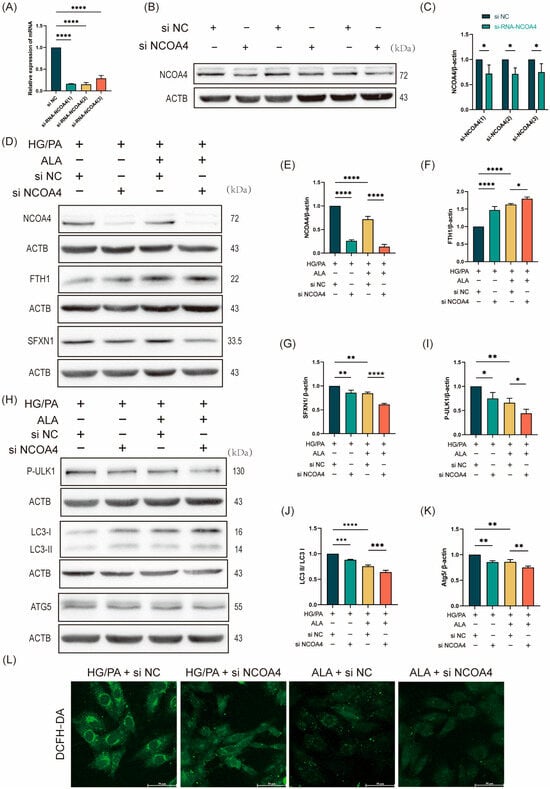 To investigate whether the protective effect of ALA against HG/PA-induced ferritinophagy is mediated through NCOA4, we performed siRNA-mediated knockdown of NCOA4 in H9C2 cells. Three distinct NCOA4-specific siRNAs were evaluated, all of which significantly reduced NCOA4 protein expression compared with the siRNA-negative control (si NC) group (Figure 4A–C). The most effective construction, si-RNA-NCOA4-1 (designated as si NCOA4), was selected for subsequent experiments. The cells were then divided into four treatment groups: HG/PA + si NC, HG/PA + si NCOA4, HG/PA + ALA + si NC, and HG/PA + ALA + si NCOA4. Western blot analysis of ferroptosis-related proteins demonstrated that NCOA4 knockdown alone decreased NCOA4 and SFXN1 expression while increasing FTH1 levels under HG/PA conditions. Similarly, ALA treatment reduced NCOA4 and SFXN1 and elevated FTH1 expression. Notably, the combination of ALA and si NCOA4 resulted in more pronounced suppression of NCOA4 and SFXN1 and stronger upregulation of FTH1 (Figure 4D–G). We then examined the expression of autophagy-related proteins. Consistent with the above findings, both NCOA4 knockdown and ALA treatment individually reduced the levels of p-ULK1, LC3B, and ATG5 in the HG/PA-injured cells. Moreover, their combination synergistically enhanced the downregulation of these autophagic markers (Figure 4H–K). To further evaluate the functional impact of NCOA4 inhibition, intracellular ROS levels were measured using DCFH-DA staining. NCOA4 knockdown significantly attenuated HG/PA-induced ROS accumulation. Furthermore, ALA co-treatment further potentiated this antioxidant effect (Figure 4L). Collectively, these results indicate that ALA attenuates ferroptosis in HG/PA-stimulated H9C2 cells, primarily by inhibiting NCOA4-mediated ferritinophagy.