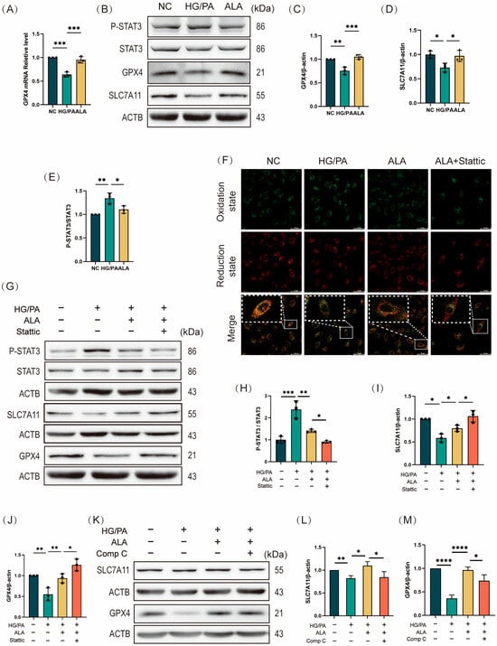 Given that lipid peroxidation is a central hallmark of ferroptosis, we next investigated the mechanism by which ALA inhibits LPO-induced ferroptosis, focusing on the SLC7A11/GSH/GPX4 axis—a key antioxidant pathway that antagonizes ferroptosis. GPX4 acts as a critical regulator of LPO by utilizing reduced glutathione (GSH) to reduce toxic lipid hydroperoxides to non-toxic alcohols, thereby preventing lipid peroxidation-driven cell death. Compared to the NC group, HG/PA co-treatment significantly downregulated GPX4 mRNA expression in H9C2 cells. ALA treatment markedly reversed this downregulation, increasing GPX4 expression at both transcriptional and translational levels (Figure 5A–C), suggesting that ALA enhances GPX4-mediated LPO clearance. Since GPX4 activity depends on intracellular GSH availability, we measured GSH levels across treatment groups. Consistent with earlier findings (Figure 1L), HG/PA exposure substantially decreased intracellular GSH compared to NC, while ALA restored GSH to near-normal levels. GSH biosynthesis depends on cystine uptake via SLC7A11, a cystine/glutamate antiporter. Western blot analysis confirmed that ALA reversed the HG/PA-induced downregulation of SLC7A11 protein expression (Figure 5B,D), indicating that ALA facilitates GSH synthesis by promoting SLC7A11-mediated cystine uptake. To further investigate the role of STAT3, a transcription factor involved in regulating ferroptosis (Figure 5B,E), in the protective effects of ALA, we employed Stattic to selectively inhibit STAT3 phosphorylation by targeting Tyr750 phosphorylation. H9C2 cells were divided into four groups: NC, HG/PA, HG/PA + ALA, and HG/PA + ALA + Stattic (5 μM; 2 h pre-treatment). Lipid ROS levels were assessed using a BODIPY 581/591 C11 probe. HG/PA stimulation markedly increased lipid ROS fluorescence, indicating LPO accumulation, while ALA significantly attenuated this effect. Co-treatment with Stattic further reduced lipid ROS, suggesting that STAT3 inhibition synergizes with ALA to suppress LPO (Figure 5F). We then evaluated the protein levels of p-STAT3, total STAT3, SLC7A11, and GPX4 across groups. HG/PA increased the p-STAT3/STAT3 ratio, indicating STAT3 activation, while ALA reduced it. Stattic enhanced ALA-induced STAT3 dephosphorylation (Figure 5G,H). Concurrently, ALA upregulated SLC7A11 and GPX4 expression under HG/PA conditions, an effect further amplified by Stattic co-treatment (Figure 5G,I,J). Finally, we also examined the protein levels of SLC7A11 and GPX4 following treatment with the AMPK inhibitor Comp C. We found that ALA upregulates SLC7A11 and GPX4 expression under HG/PA conditions, an effect that is reversed upon addition of Comp C. This indicates that the SLC7A11/GPX4 antioxidant axis is regulated by AMPK (Figure 5K–M). In summary, ALA may promote the expression of the SLC7A11/GSH/GPX4 pathway by inhibiting STAT3 phosphorylation, thereby enhancing the antioxidant capacity of H9C2 cardiomyocytes and attenuating HG/PA-induced iron overload, ultimately reducing LPO accumulation.
