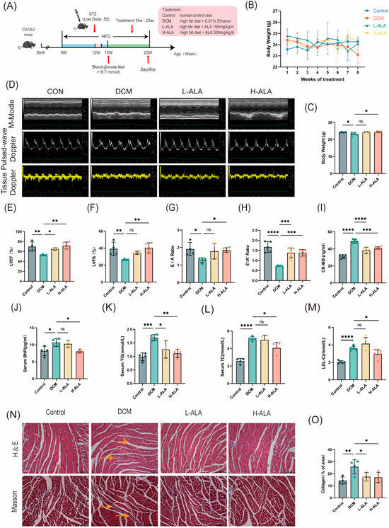 Eight-week-old healthy C57BL/6J mice were randomly allocated into four groups. Mice fed a normal diet served as the control group. Type 2 diabetes was induced with a high-fat diet combined with a low-dose streptozotocin (STZ) injection. Mice in which diabetes was successfully induced were then randomly divided into three groups based on their average body weight: diabetic cardiomyopathy model group (DCM), a low-dose ALA treatment group (150 mg/kg/day; L-ALA), and a high-dose ALA treatment group (300 mg/kg/day; H–ALA). The treatment lasted 8 weeks (Figure 6A). During the ALA treatment, the mice in the ALA group gradually gained weight (Figure 6B). Body weight decreased in the DCM model group and increased in the high-dose ALA group, and no significant difference was found between the low-dose group and the DCM group (Figure 6C). After the treatment period, cardiac structure and function were evaluated using echocardiography and Doppler ultrasound. Compared with the control group, the diabetic mice exhibited impaired cardiac systolic function (with preserved ejection fraction). High-dose ALA treatment significantly improved left ventricular ejection fraction (LVEF%) and left ventricular fractional shortening (LVFS%), but no significant improvement was observed in the low-dose group (Figure 6D–F). The DCM group showed decreased E/A and E′/A′ ratios, which increased after high-dose ALA treatment (Figure 6G,H). Serum levels of creatine kinase-MB (CK–MB), brain natriuretic peptide (BNP), total cholesterol (TC), triglycerides (TG), and low-density lipoprotein cholesterol (LDL–C) were significantly elevated in the diabetic mice compared to the controls. High-dose ALA treatment markedly reduced these biomarkers, but no significant changes were observed in the low-dose group (Figure 6I–M). H&E staining revealed well-organized, densely arranged cardiomyocytes with intact fibers in the control mice. In contrast, the cardiomyocytes in the DCM group exhibited disordered cell arrangement, irregular morphology, and localized fiber disruption. High-dose ALA treatment improved myocardial cell alignment and reduced fiber breakage, with better structural preservation than in the low-dose group (Figure 6N). Masson staining indicated that ALA treatment significantly attenuated myocardial fibrosis in the DCM mice (Figure 6N,O). These results demonstrate that high-dose α-linolenic acid alleviates cardiac dysfunction in mice with diabetes induced using a high-fat diet and low-dose streptozotocin.