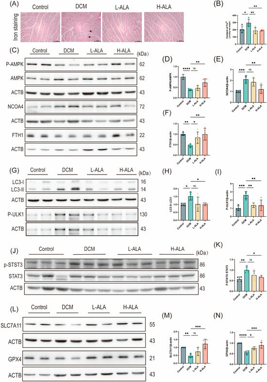 High-dose ALA treatment inhibits ferritinophagy in mice with diabetes induced by high-fat diet and low-dose STZ. (A) Representative images of Prussian blue staining, black arrows represent the sites of iron ion stasis. (scale bare: 100 μm). (B) Intracellular iron ion content in cardiac tissues (n = 4). (C–F) Representative Western blot (C) and quantification analysis (D–F) of p-AMPK, AMPK, NCOA4, and FTH1 in myocardial tissues (n = 4). (G–I) Representative Western blot (G) and quantification analysis (H,I) of autophagy-related proteins LC3B and p-ULK1 (n = 4). (J,K) Representative Western blot (J) and quantification analysis (K) of p-STAT3, STAT3 protein expression (n = 4). (L–N) Representative Western blot (L) and quantification analysis (M,N) of SLC7A11 and GPX4 protein expression (n = 4). Note: Data are presented as means ± SDs. * p < 0.05, ** p < 0.01, *** p < 0.001, and **** p < 0.0001, ns p > 0.05.