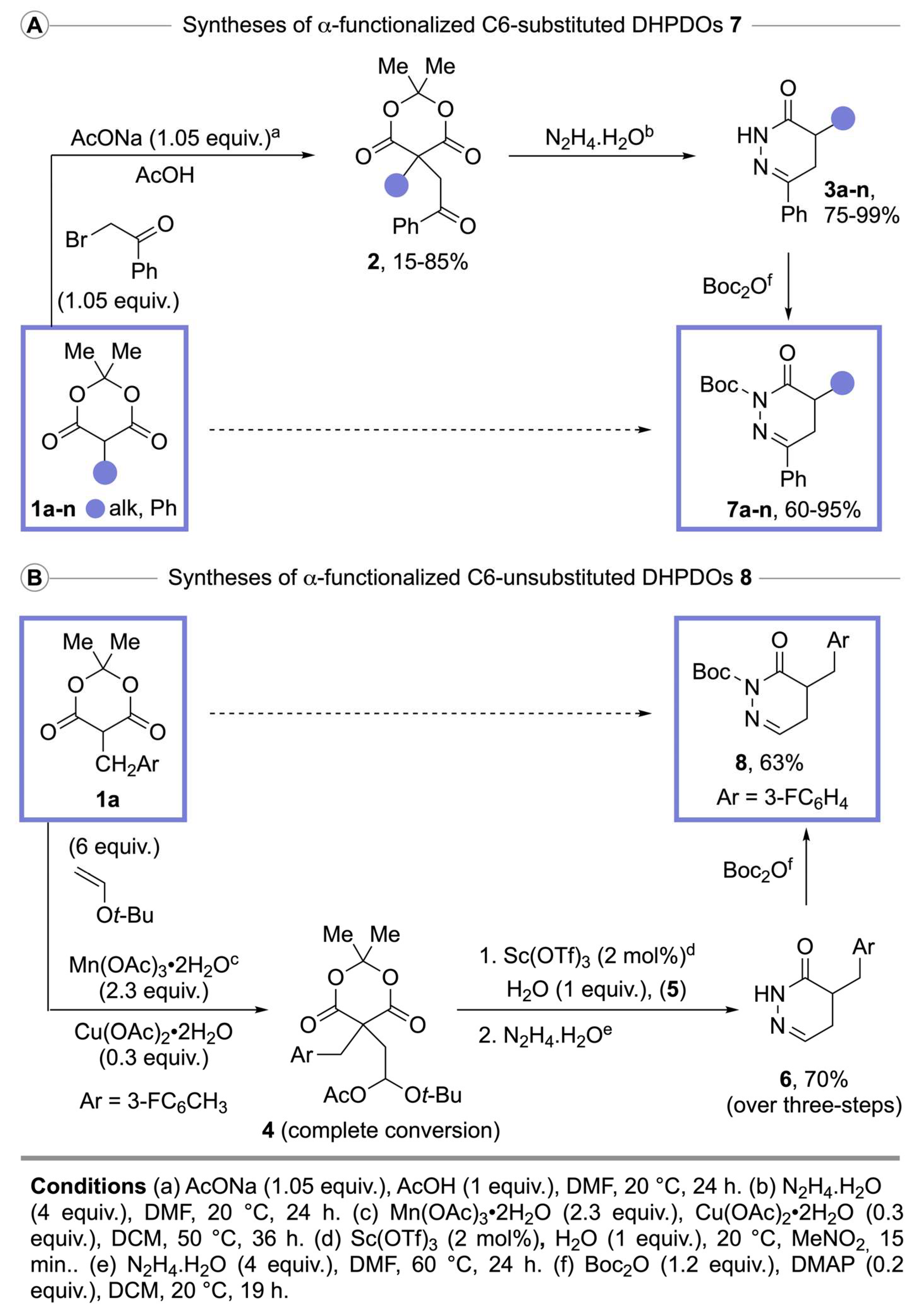 - Compounds 7: Boc2O (938.5 mg, 4.3 mmol) and DMAP (87.5 mg, 716 µmol) were introduced in a round-bottom flask (N2 atmosphere). The N-unsubstituted 4,5-dihydropyridazinone 3 (3.58 mmol) was dissolved in anhydrous DCM (24 mL, 0.15 M) and introduced slowly into the round-bottom flask at room temperature. The solution was vigorously stirred overnight. Then, the solvent was evaporated under reduced pressure and the crude mixture was purified by silica gel column chromatography producing 7 (exact experimental and analytical details can be found in the online supporting information).