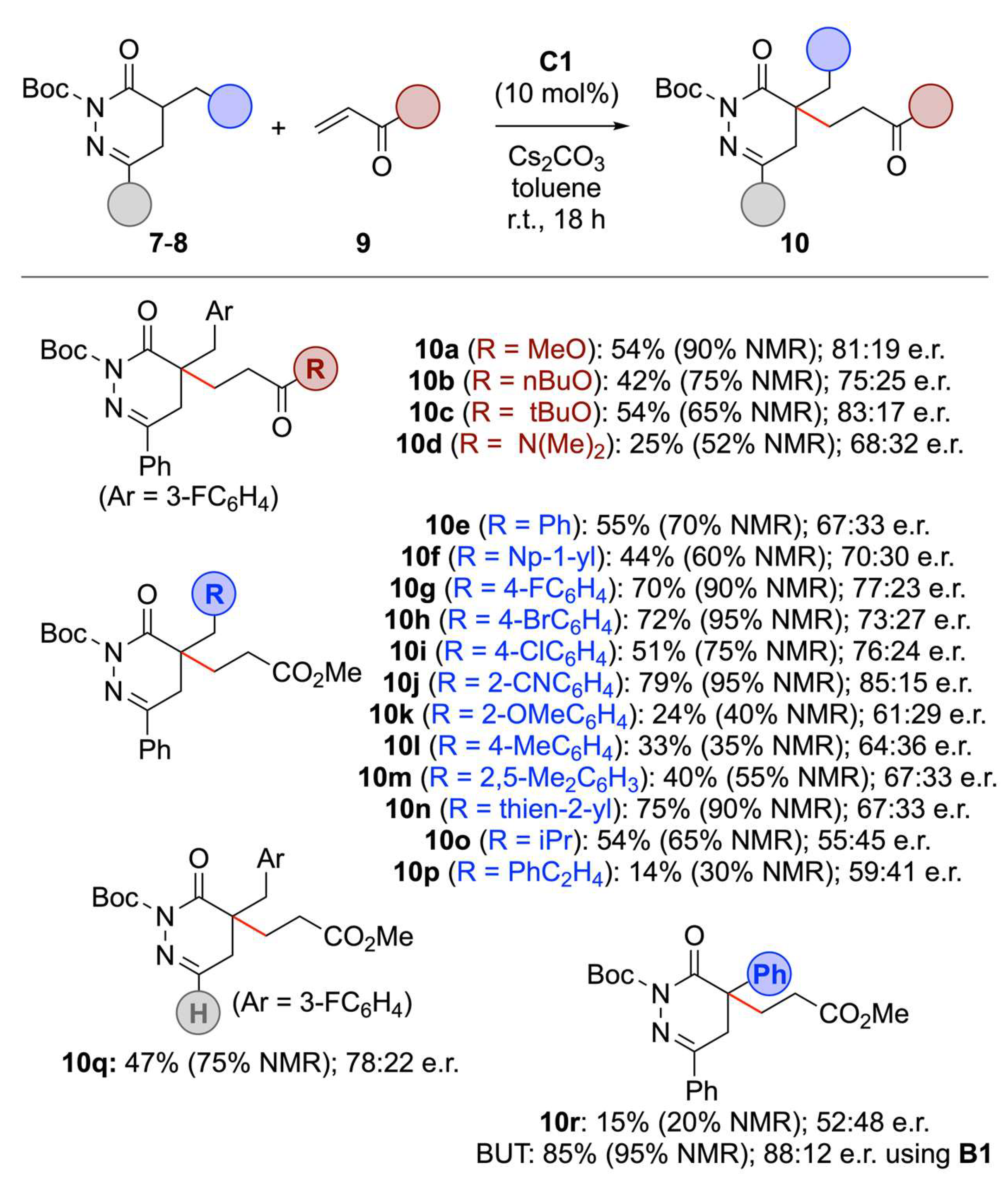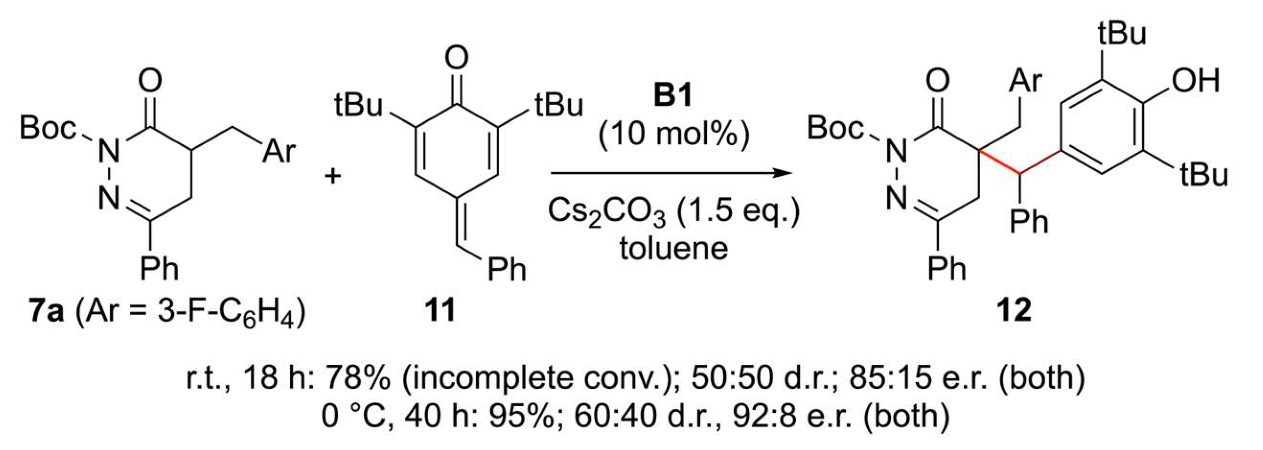 - Spirobiindane-based ammonium salt C1 (9.2 mg, 0.01 mmol) and Cs2CO3 (98 mg, 0.3 mmol) were introduced into a 2 mL vial at room temperature. The N-Boc dihydropyridazinone derivative 7 or 8 (0.1 mmol) was dissolved in toluene (1 mL, 0.1 M) and added to the vial followed by the Michael acceptor 9 (0.3 mmol). The mixture was stirred at room temperature for 18 h (1100 rpm). The crude mixture was filtered through a pad of silica gel using EtOAc as an eluent. Then, the crude mixture was purified by silica gel column chromatography producing the corresponding α,α-difunctionalized pyridazinone derivatives 10 (exact experimental and analytical details can be found in the online supporting information).