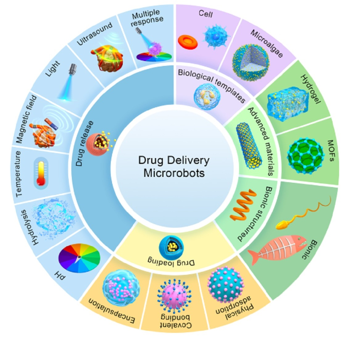 24]. However, their limited surface area constrains payload capacity, limiting therapeutic applicability. To overcome this restriction, researchers have started exploring bio-templated microrobot systems based on organisms such as bacteria [