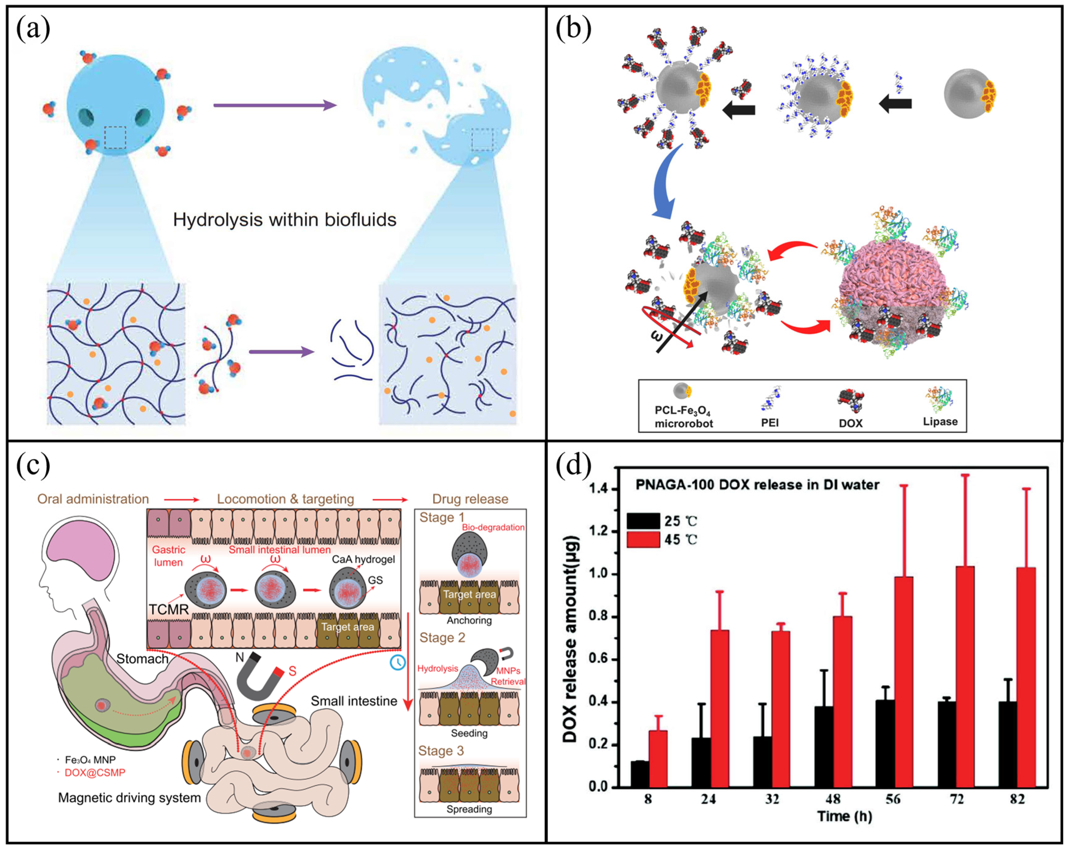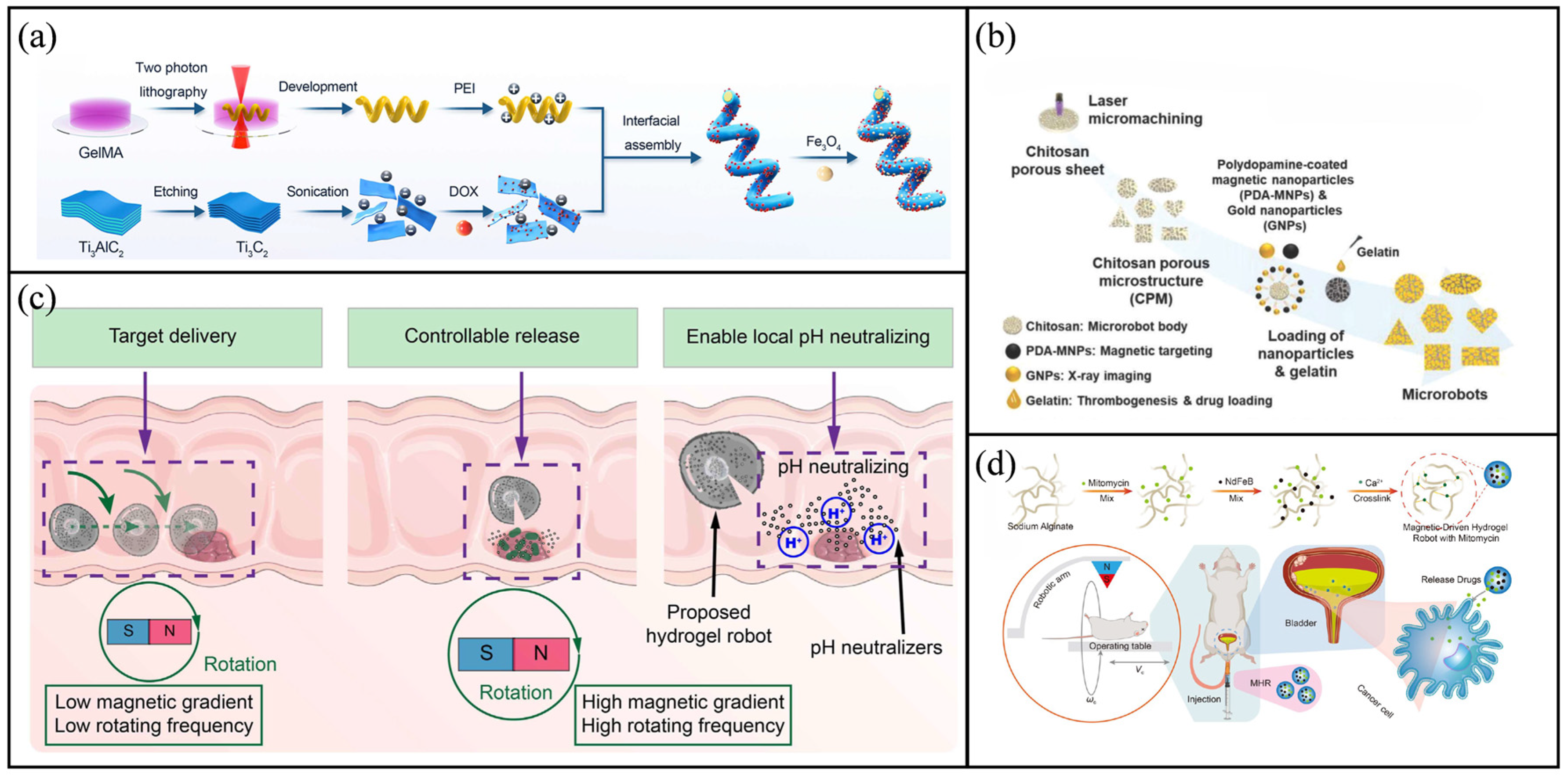 38] have been extensively utilised in the fabrication of microrobots. Hydrogels have been extensively used in the design of magnetic microrobots due to their excellent biocompatibility and degradability. These microrobots can achieve high encapsulation rates through encapsulation, enabling selective release in response to a change in pH or temperature. Meanwhile, embedded magnetic nanoparticles enable remote control, allowing the synchronised management of movement and release profiles [
