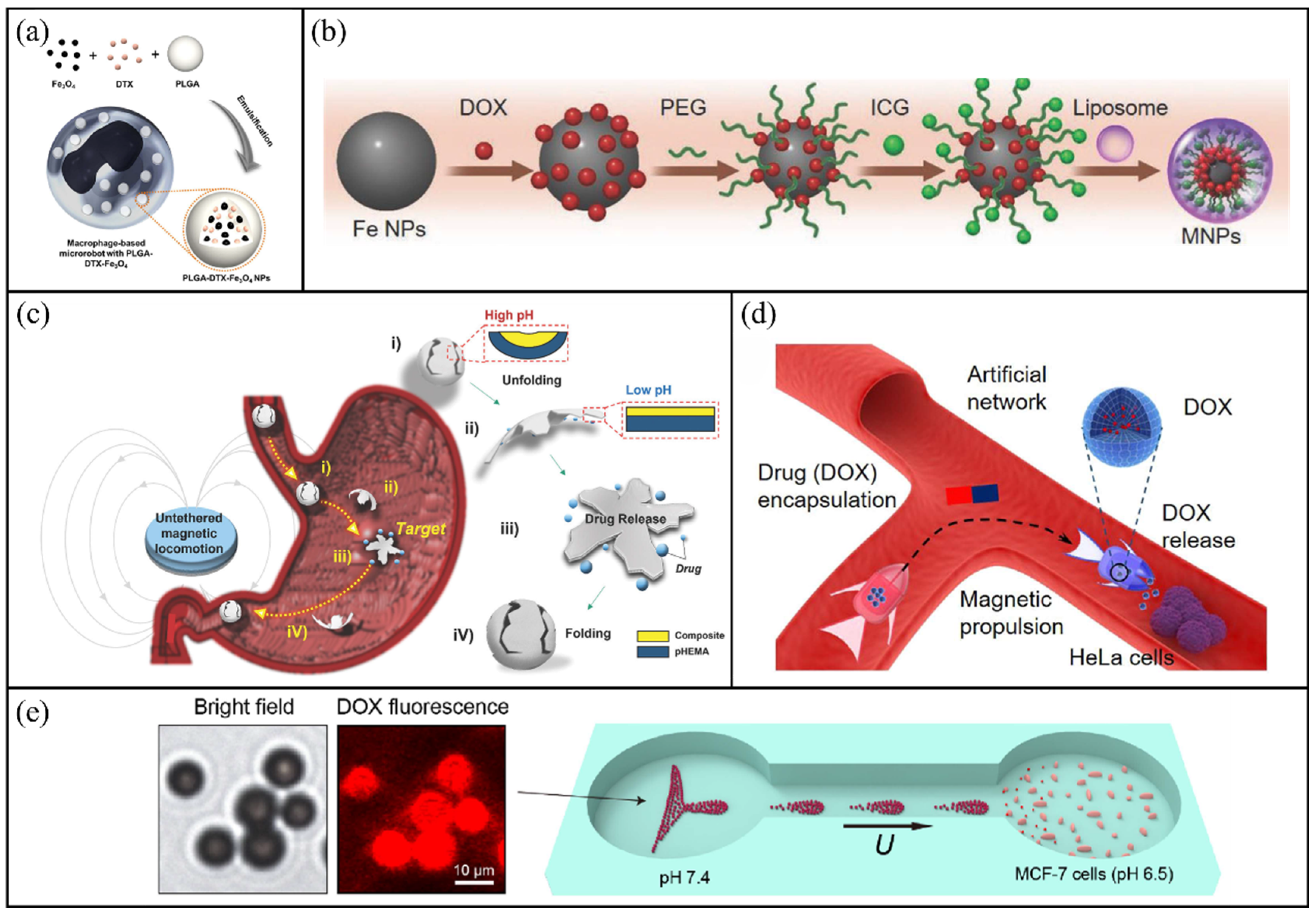 Macrophages are frequently used as carriers for cell-based microrobots because of their innate phagocytic activity and tumour-targeting ability. In addition, their excellent biocompatibility enables them to efficiently internalise magnetic nanoparticles, allowing directional movement and targeted delivery under the control of an external magnetic field. Sun et al. developed a magnetically controlled cell robot (MCRs) based on macrophages [