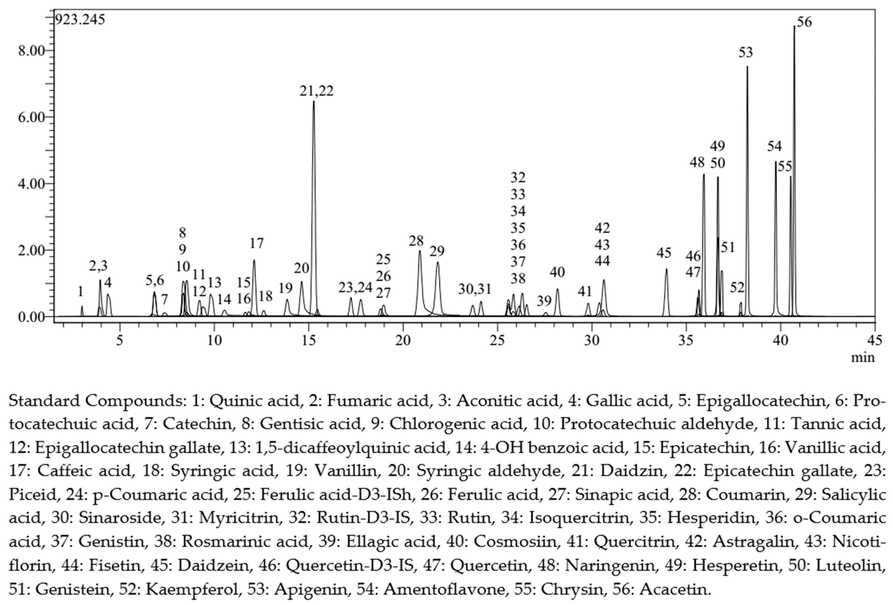 | 1 | Quinic acid | 3.0 | 190.8 | 93.0 | 0.0372 | 0.655 ± 0.012 A | 0.725 ± 0.013 a | 0.192 ± 0.004 D | 0.168 ± 0.003 d | 0.633 ± 0.012 B | 0.269 ± 0.005 c | 0.489 ± 0.009 C | 0.455 ± 0.008 b |