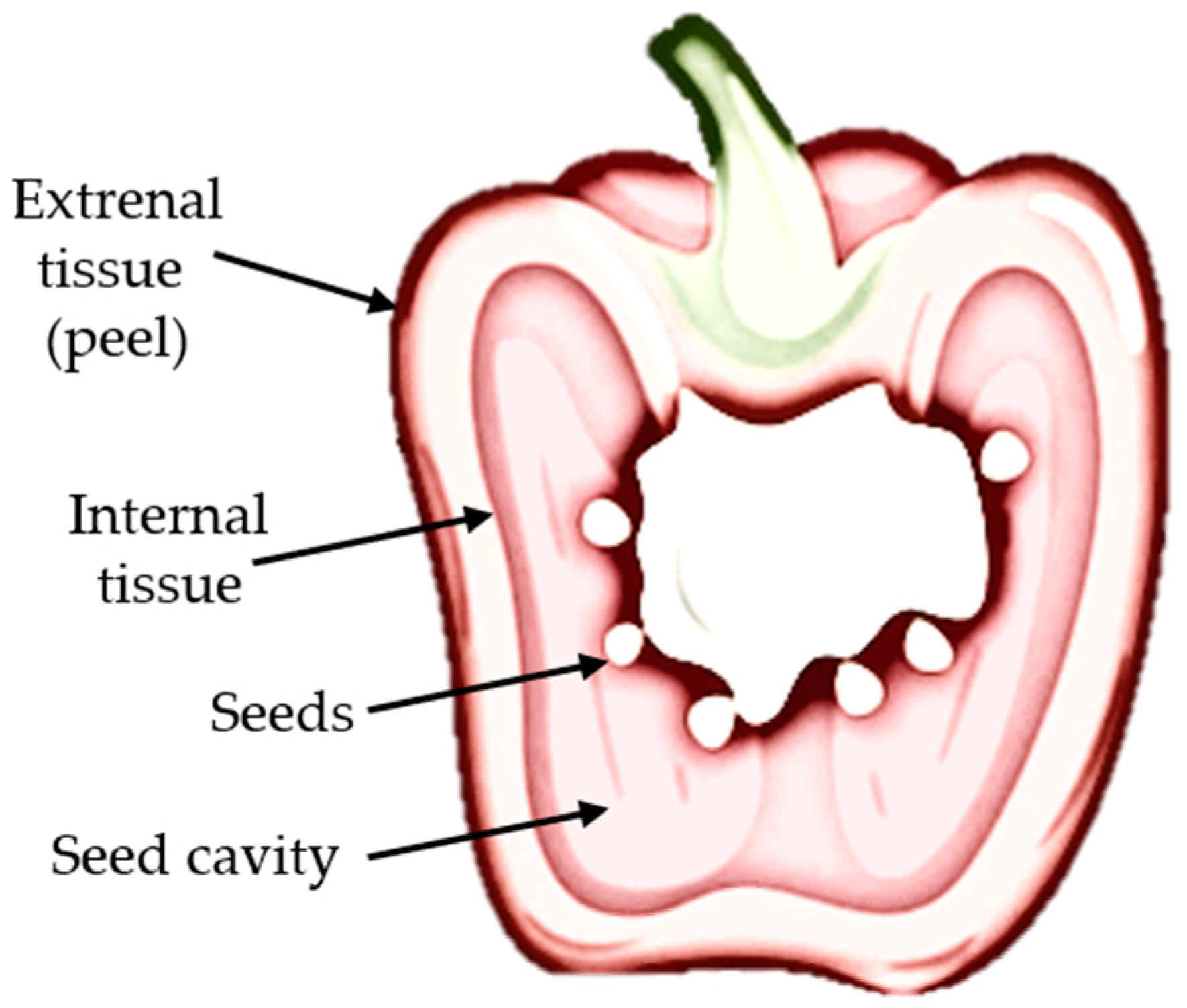 - Palma-Salgado, S.; Vargas, L.; Rababah, T.M.; Feng, H. Impact of Tissue Decay on Drying Kinetics, Moisture Diffusivity, and Microstructure of Bell Pepper and Strawberry. Foods 2025, 14, 3401. [Google Scholar] [CrossRef] [PubMed]