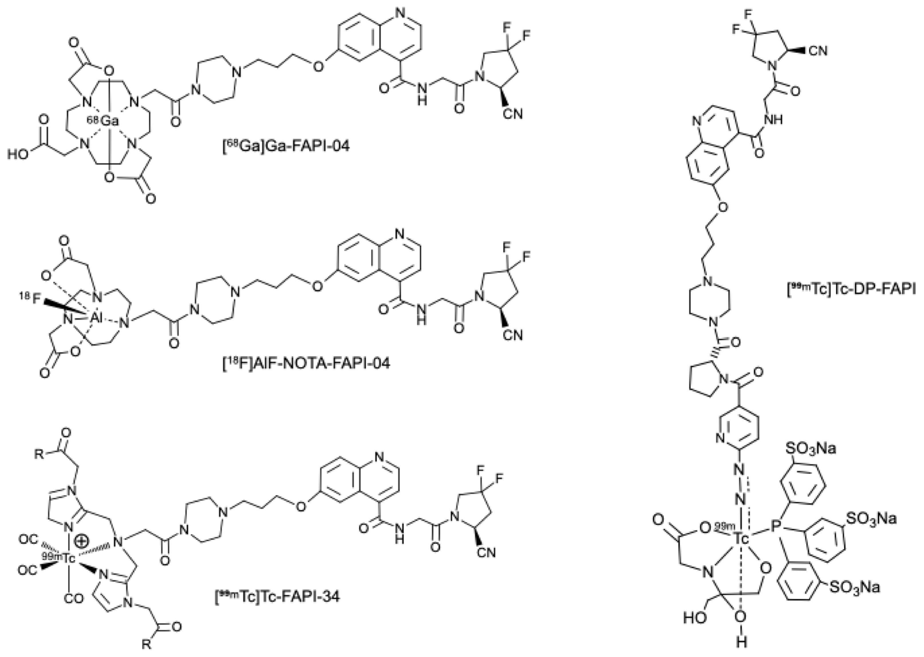 Radiopharmaceuticals based on FAP inhibitors (FAPI) are small-molecule ligands (often quinoline-based) that bind with high affinity and selectivity to FAP [