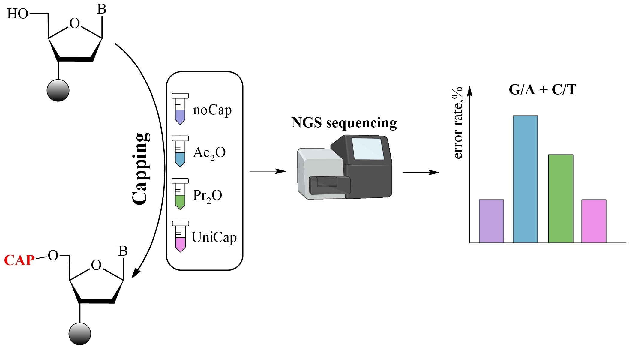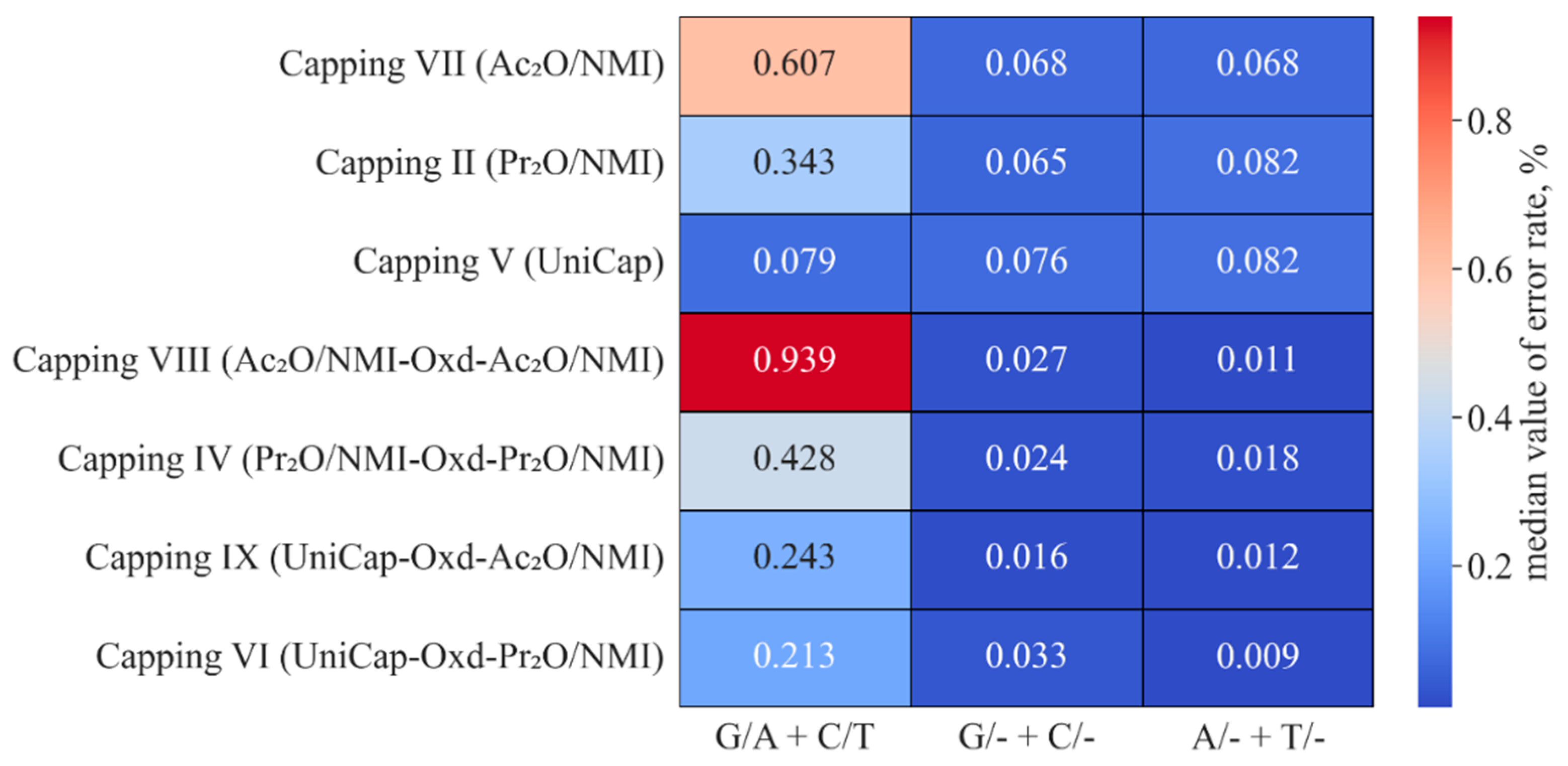 These findings indicate that the use of carboxylic acid anhydrides of less acidic carboxylic acids is preferable for capping. As demonstrated, propionic anhydride maintains the effective elimination of N − 1 sequences during synthesis, while the associated increase in G/A + C/T substitution frequency is less pronounced than that observed with acetic anhydride.