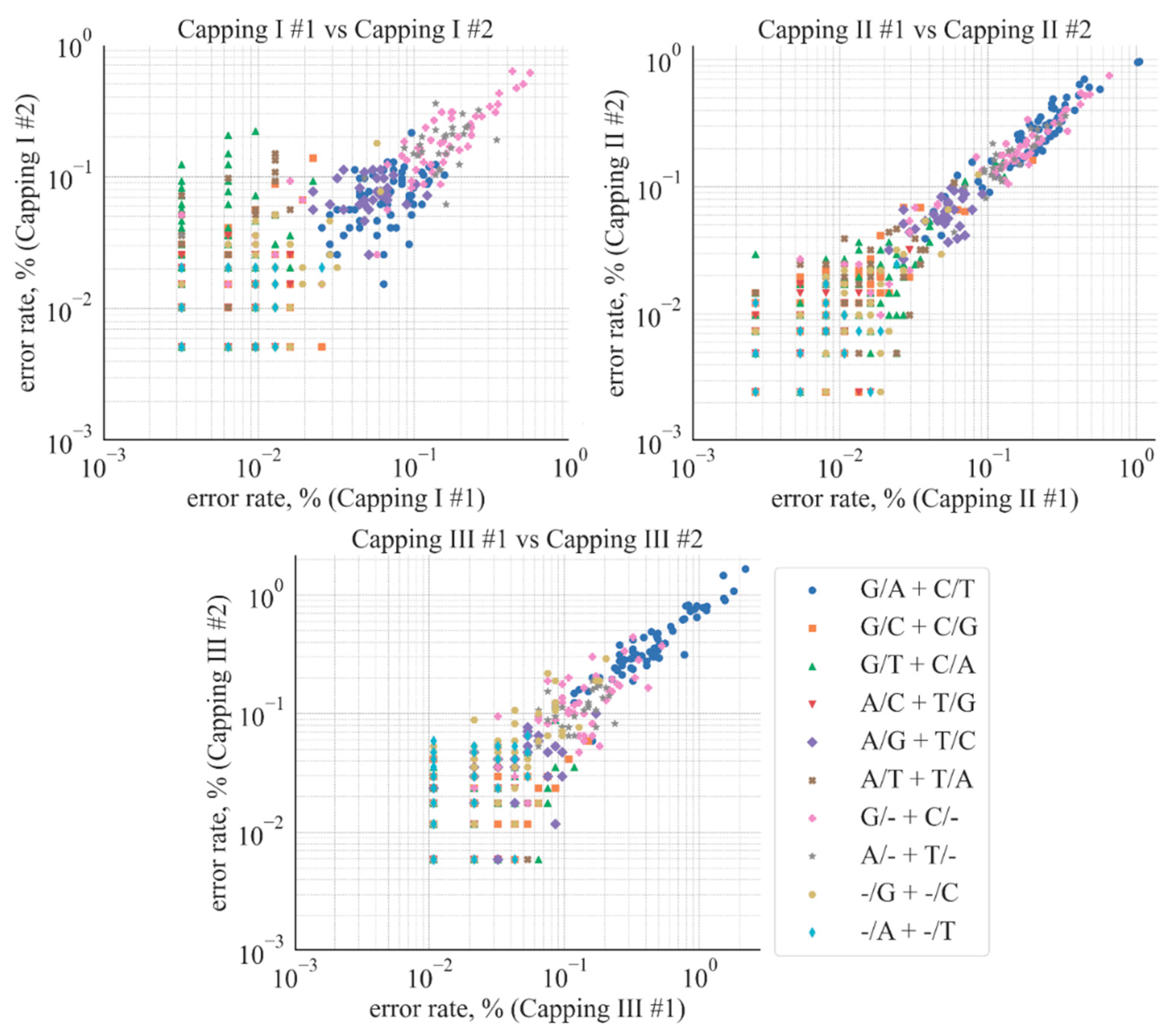Supplementary File S3. A comparison between the two independent syntheses for each capping condition demonstrates the high reproducibility of the errors profile for each protocol (