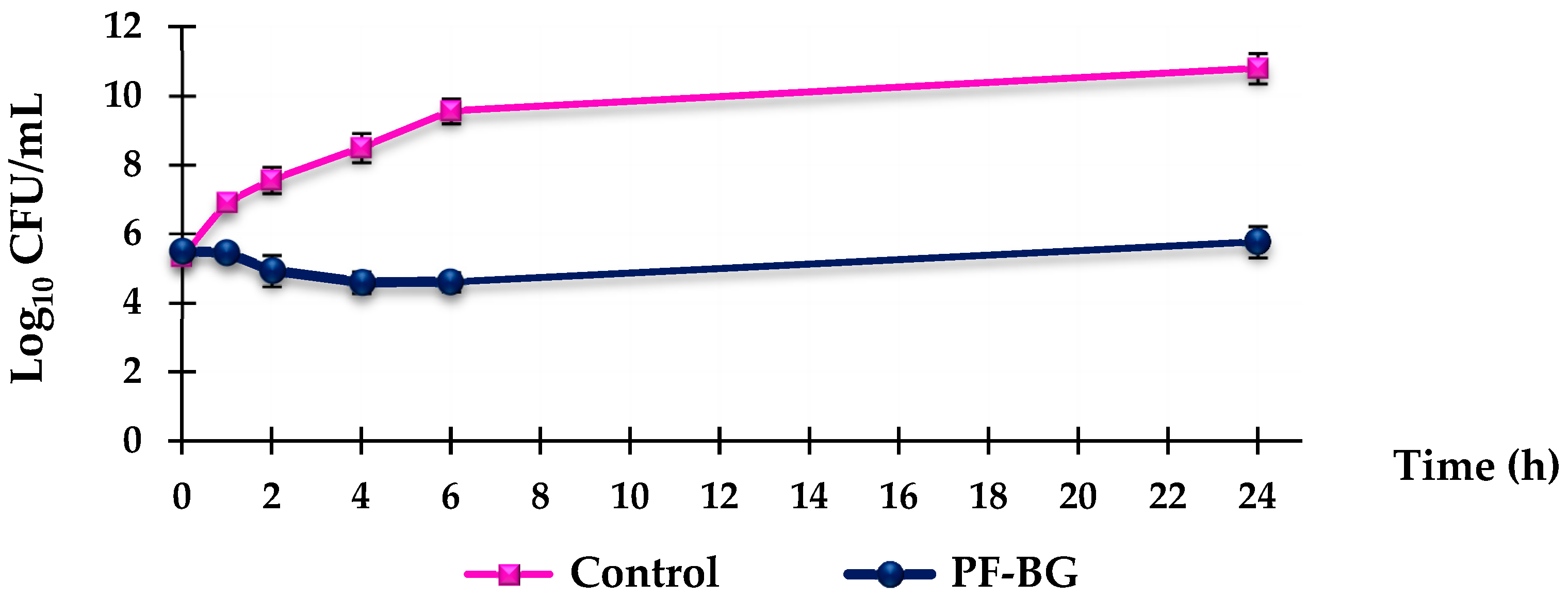 To determine the antibacterial mechanism of action of the extract, time-kill assays were performed on S. aureus, as the most clinically relevant species. For this purpose, bactericidal curves were obtained, studying three selected strains (18, B, and ATCC 29213) at a concentration four times higher than the MIC for 24 h. All strains, despite displaying different resistance phenotypes, showed overlapping results, exemplified in Figure 1 by the 18 MRSA strains. As shown, strain treatment with PF-BG revealed the extract’s bacteriostatic activity at 24 h, essentially maintaining the bacterial load of the initial inoculum after a slight reduction in the initial bacterial concentration during the first 6 h.