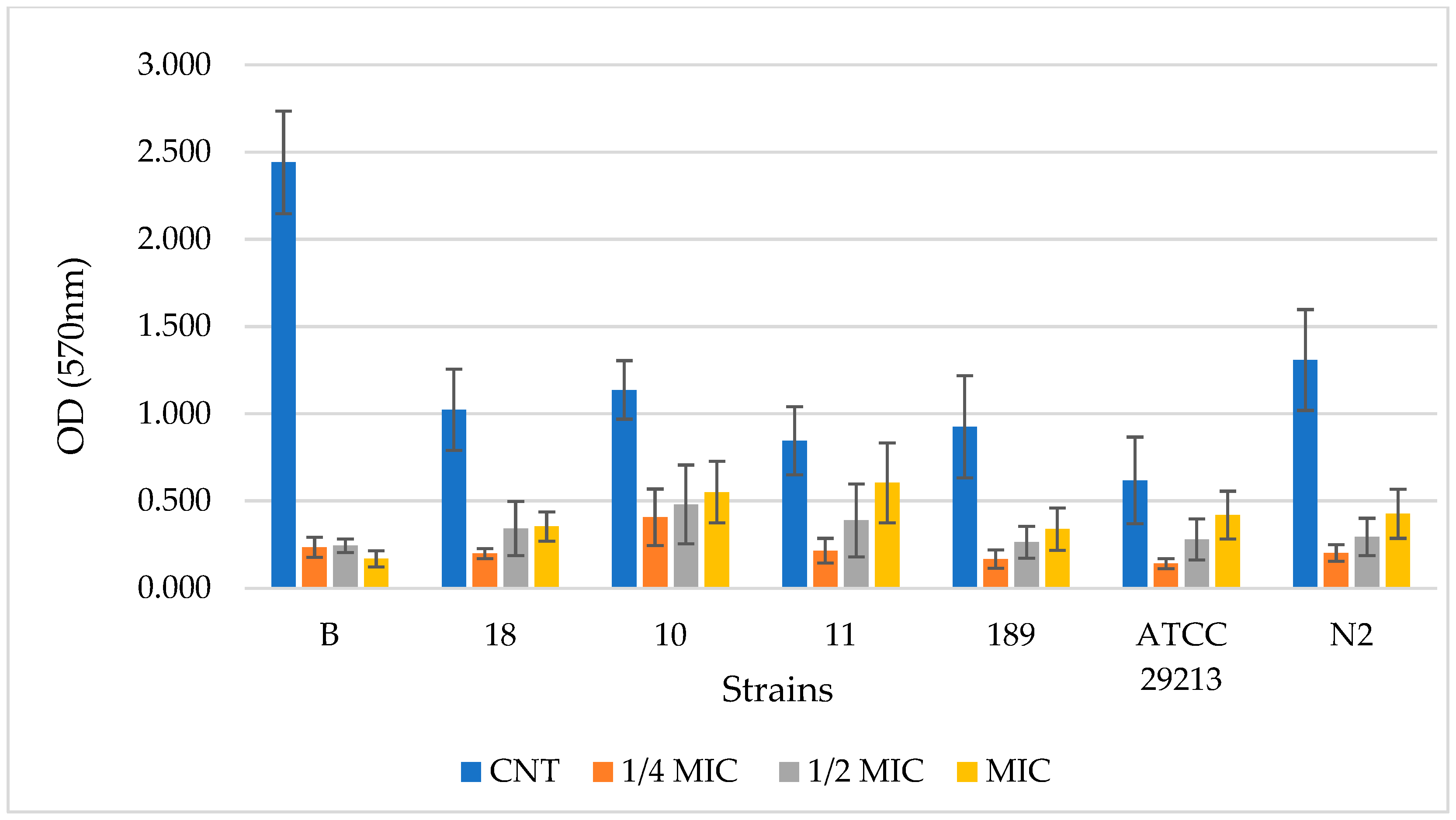 In regard to PF-BG, for all strains, the CNT sample is significantly different from ¼ MIC, ½ MIC, and MIC (p < 0.0001 ****). Only for strain 11 is there also a significant difference for ¼ MIC vs. MIC and for ½ MIC vs. MIC. For strain AT20213, there is also a significant difference for ¼ MIC vs. MIC (p < 0.001 ***).