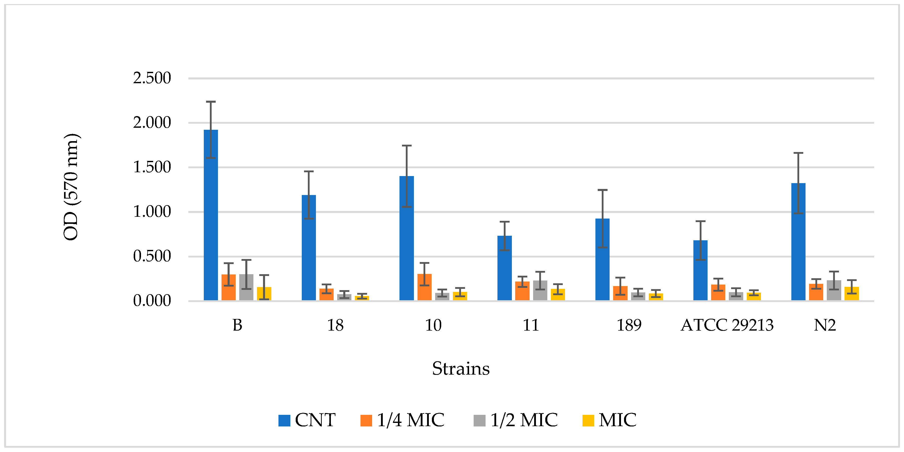 Figure 2 and Figure 3 display the results related to the quantified biofilm biomass formation obtained by the crystal violet assay [33] for BF-BG and SDA, respectively. Data are expressed as the optical density (OD) of each well stained with crystal violet, measured at 570 nm using a microtiter-plate reader. The OD of each selected strain containing 3 different PF-BG and SDA concentrations (¼ MIC. ½ MIC, and MIC), respectively, in comparison to the control (strain without sample), is reported.