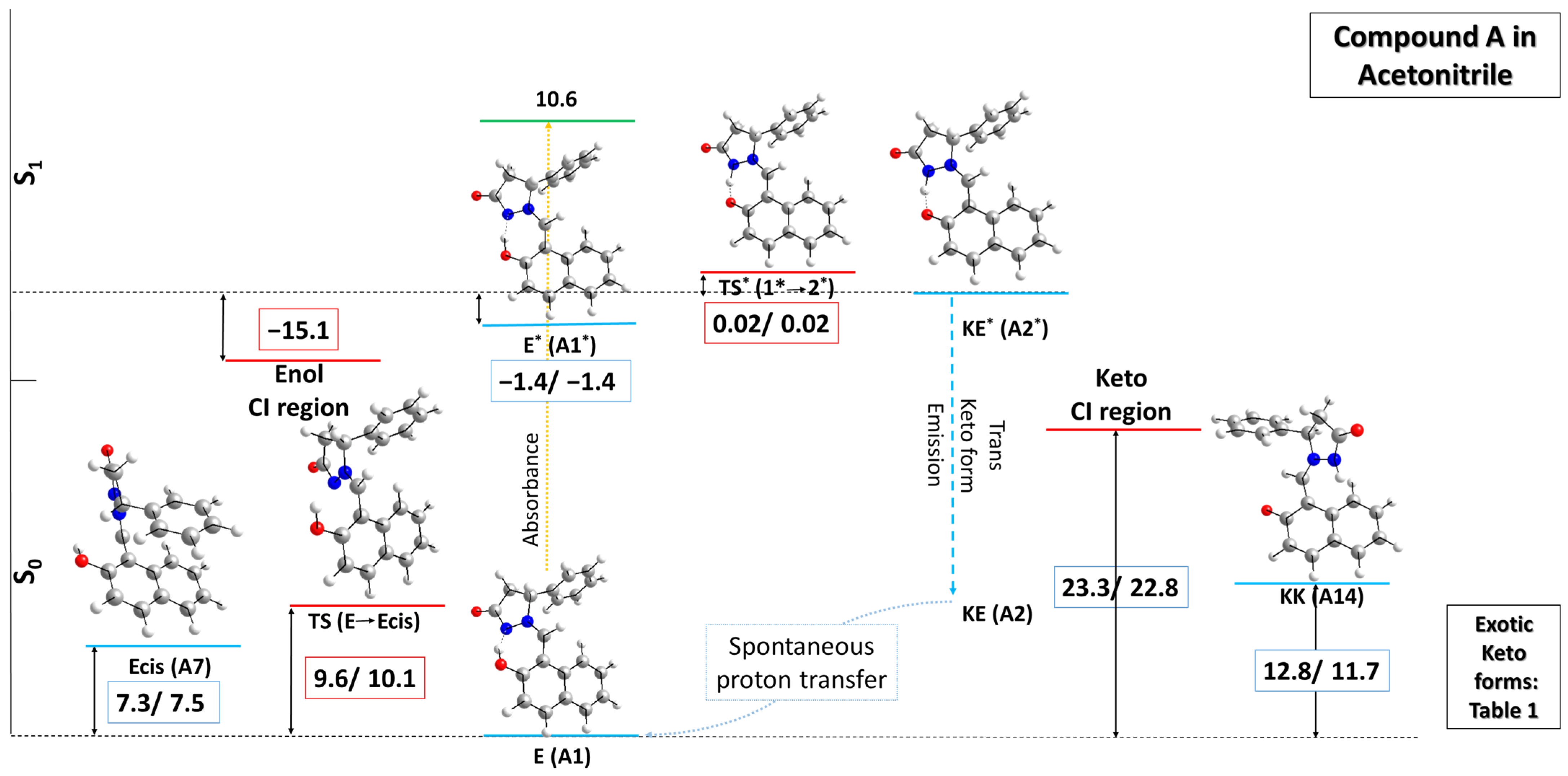 - Zhou, P.; Han, K. Unraveling the Detailed Mechanism of Excited state Proton Transfer. Acc. Chem. Res. 2018, 51, 1681–1690. [Google Scholar] [CrossRef]