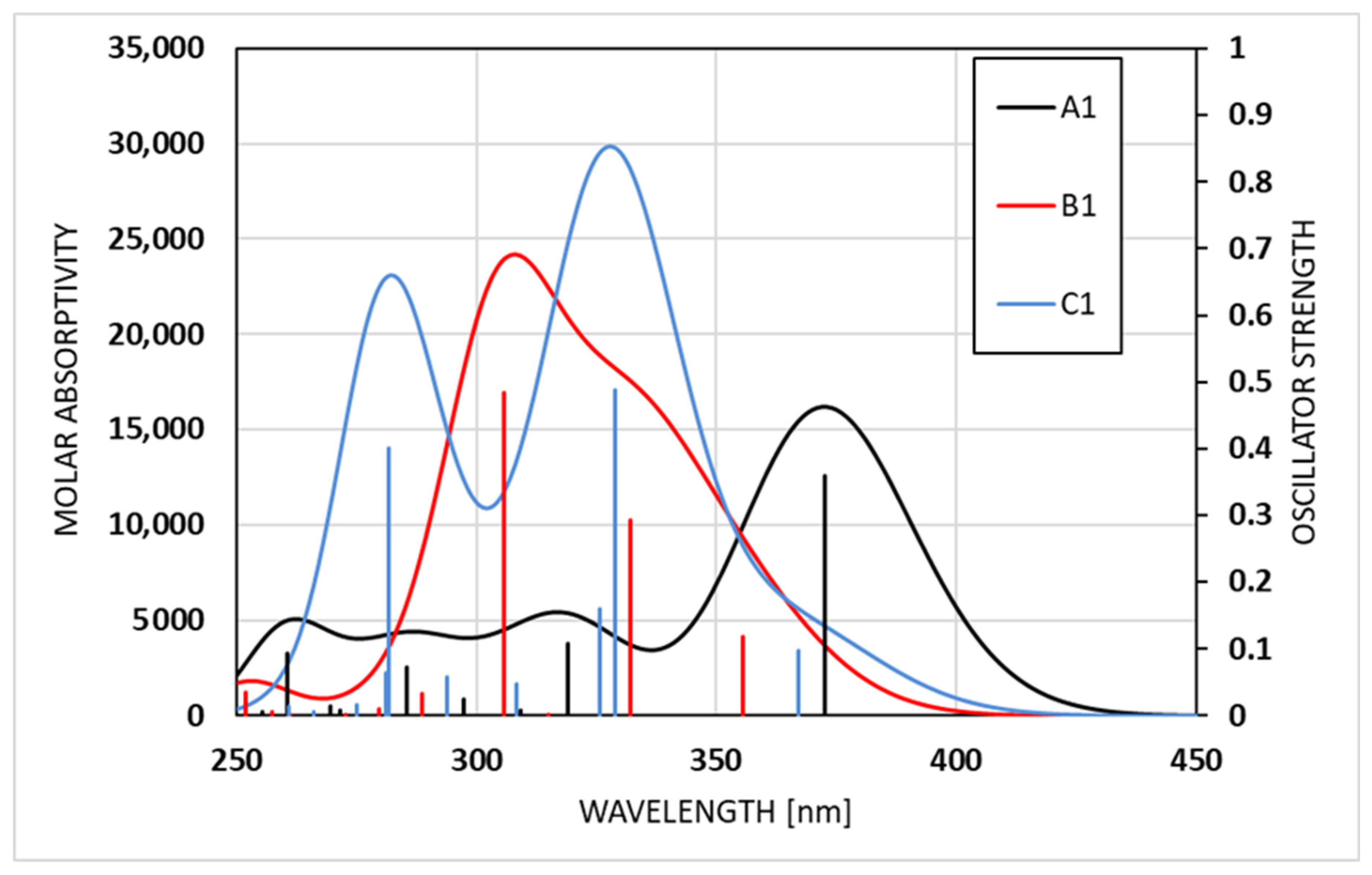 | C1 | Excited state 1 | 99 -> 101 | −0.14335 | 3.3783 | 367 | 0.0979 |