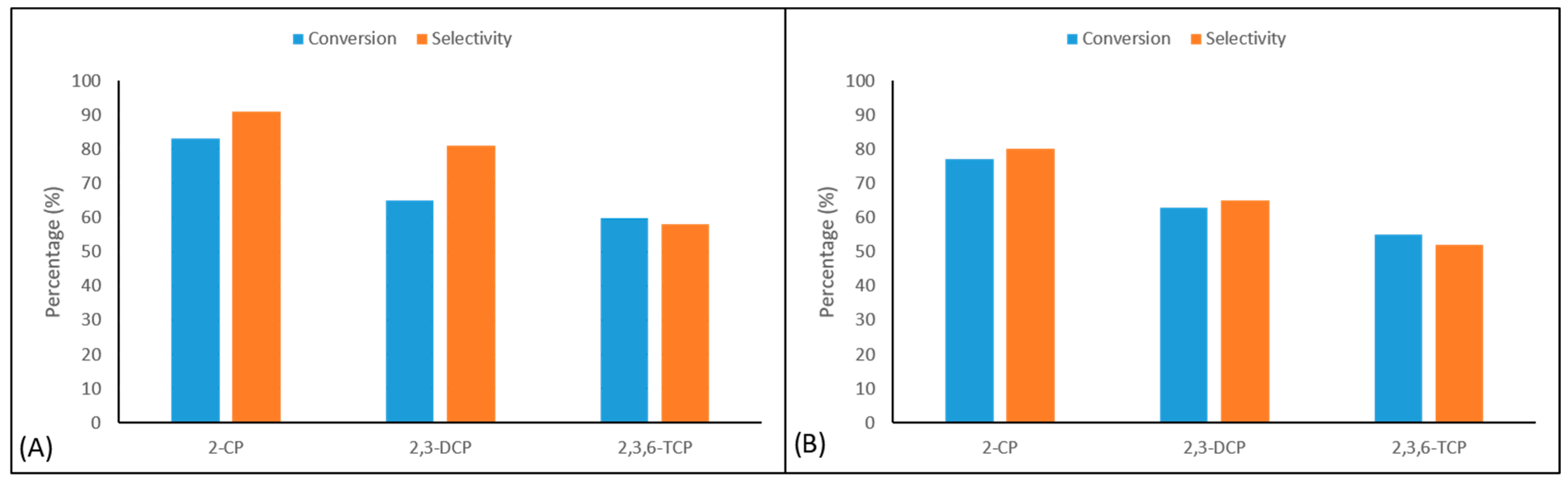 | g-C3N4 | 2-CP, 2,3-DCP, 2,3,6-TCP | BQ derivatives | ~65 | ≥45.0 |