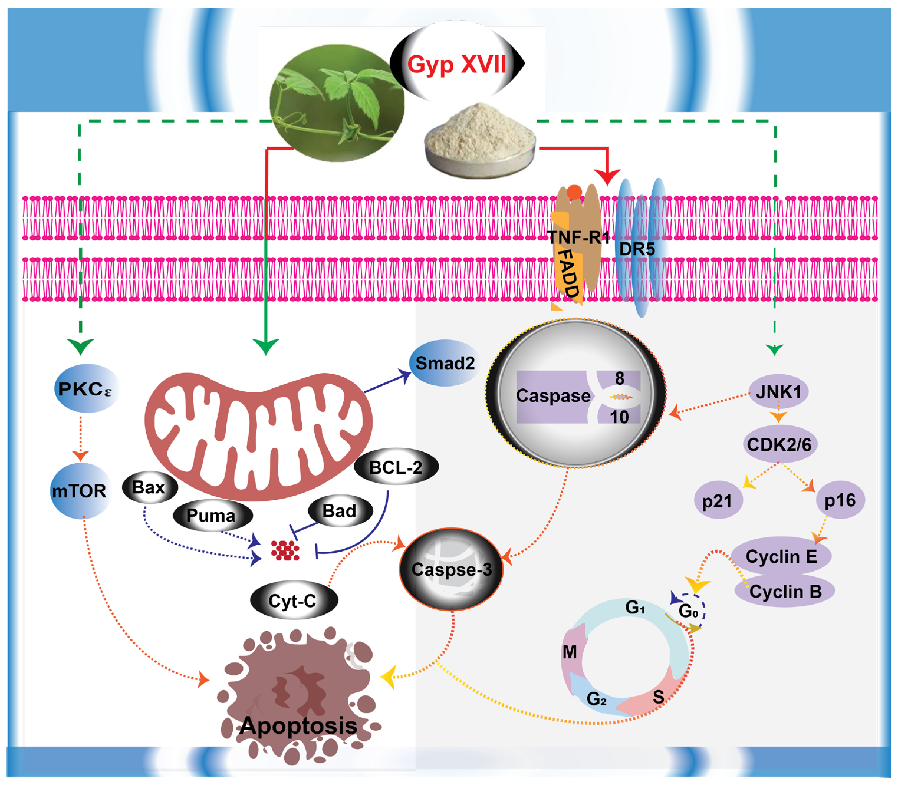 - Ahmad, B.; Khan, S.; Nabi, G.; Gamallat, Y.; Su, P.; Jamalat, Y.; Duan, P.; Yao, L. Natural gypenosides: Targeting cancer through different molecular pathways. Cancer Manag. Res. 2019, 11, 2287–2297. [Google Scholar] [CrossRef] [PubMed]