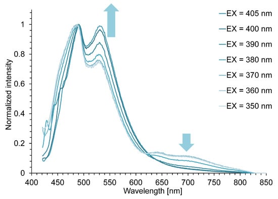To investigate these emission behaviors, the fluorescence spectra of 7c in 10% TFA/CH2Cl2 were measured while varying the excitation wavelength from 350 nm to 405 nm (Figure 4). If the intensity ratio between the shorter and longer-wavelength emissions changes upon varying the excitation wavelength, it can be considered that the fluorescence originates from multiple emissive species. In practice, the fluorescence spectra of 7c showed a decrease in the near-infrared emission band and a simultaneous increase in the fluorescence intensity at λFlu = 533 nm as the excitation wavelength was shifted to longer wavelengths. This excitation-wavelength dependence of the fluorescence spectra indicates that the fluorescence of 7c arises from multiple emissive species.