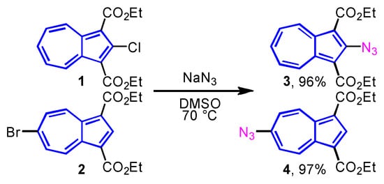Synthesis: Prior to the synthesis of azulene-substituted triazoles, azidoazulenes were prepared from 2-chloro and 6-bromoazulene derivatives 1 and 2 bearing two-ethoxycarbonyl functions at the 1,3-positions of the azulene ring. Since the synthesis of 6-azidoazulene derivative 4 was previously reported by us, a similar approach was adopted for the preparation of 2-azidoazulene derivative 3 [20]. Thus, the preparation of 2- and 6-azidoazulene derivatives 3 and 4 [21] were accomplished in 96% and 97% yields, respectively, by the aromatic nucleophilic substitution (SNAr) reaction of 1 and 2 with sodium azide (NaN3) in dimethyl sulfoxide (DMSO) at 70 °C (Scheme 1).