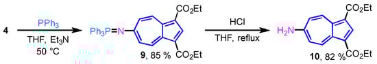 The Staudinger reaction is a well-established method for the conversion of azides into primary amines under relatively mild conditions [24,25,26,27]. In this transformation, azides react with phosphines to afford iminophosphorane intermediates, which can subsequently be hydrolyzed to yield the corresponding primary amines. Although the synthesis of 6-aminoazulene derivative 10 via the reduction of 4 was previously reported by us [17], that method required the use of Raney-Ni—a highly reactive reducing agent. To develop a more convenient and safer alternative, we explored the Staudinger reaction as a method for converting 4 into 10.