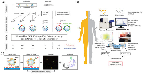 - Welsh, J.A.; Goberdhan, D.C.I.; O’Driscoll, L.; Buzas, E.I.; Blenkiron, C.; Bussolati, B.; Cai, H.; Di Vizio, D.; Driedonks, T.A.P.; Erdbrügger, U.; et al. Minimal information for studies of extracellular vesicles (MISEV2023): From basic to advanced approaches. J. Extracell. Vesicles 2024, 13, e12404. [Google Scholar] [CrossRef]