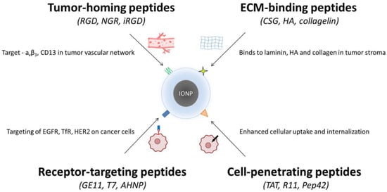 These multimodal platforms exemplify the flexibility of peptide–IONP systems and their potential in precision nanomedicine. The classes of peptides used for functionalizing IONPs are depicted in Figure 2.