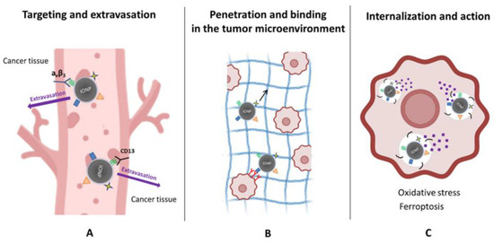 Mechanistic actions of peptide-functionalized iron oxide nanoparticles (IONPs) in tumors. (A) Targeting and extravasation: Peptide ligands promote selective binding of IONPs to tumor vasculature by recognizing receptors such as αvβ3 integrins and CD13, facilitating vascular adhesion and extravasation into cancer tissue. (B) Penetration and microenvironmental interactions: Following extravasation, peptide–IONPs move through the tumor extracellular matrix (black arrow), where ECM-binding or tumor-penetrating sequences enhance stromal engagement and improve distribution within the tumor microenvironment. (C) Internalization and therapeutic action: Cancer cells internalize peptide–IONPs via receptor-mediated or membrane-active pathways. Intracellular processing releases iron ions, driving oxidative stress and lipid peroxidation, ultimately promoting ferroptosis and related cytotoxic mechanisms.