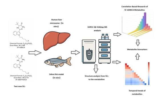 25], no integrated analyses have combined both in vitro and in vivo models to comprehensively elucidate its metabolic profile. Moreover, to date, there have been no published reports on the metabolic fate of 5F-ADBICA. To address these gaps, we employed a combined approach integrating HLM-based in vitro assays, zebrafish-based in vivo modeling, and UHPLC-QE-Orbitrap-MS analysis to characterize the phase I metabolic pathways of these two compounds. Furthermore, we conducted time-resolved analyses of metabolite dynamics over 24 h and examined correlations among different metabolites to identify potential metabolite biomarkers. Through this comprehensive investigation, we aim to fill critical gaps in temporal metabolic profiling knowledge and provide a robust analytical framework for the forensic detection of 5F-ADB-PINACA and 5F-ADBICA. This study also provides a basis for future clinical studies on human intoxications.