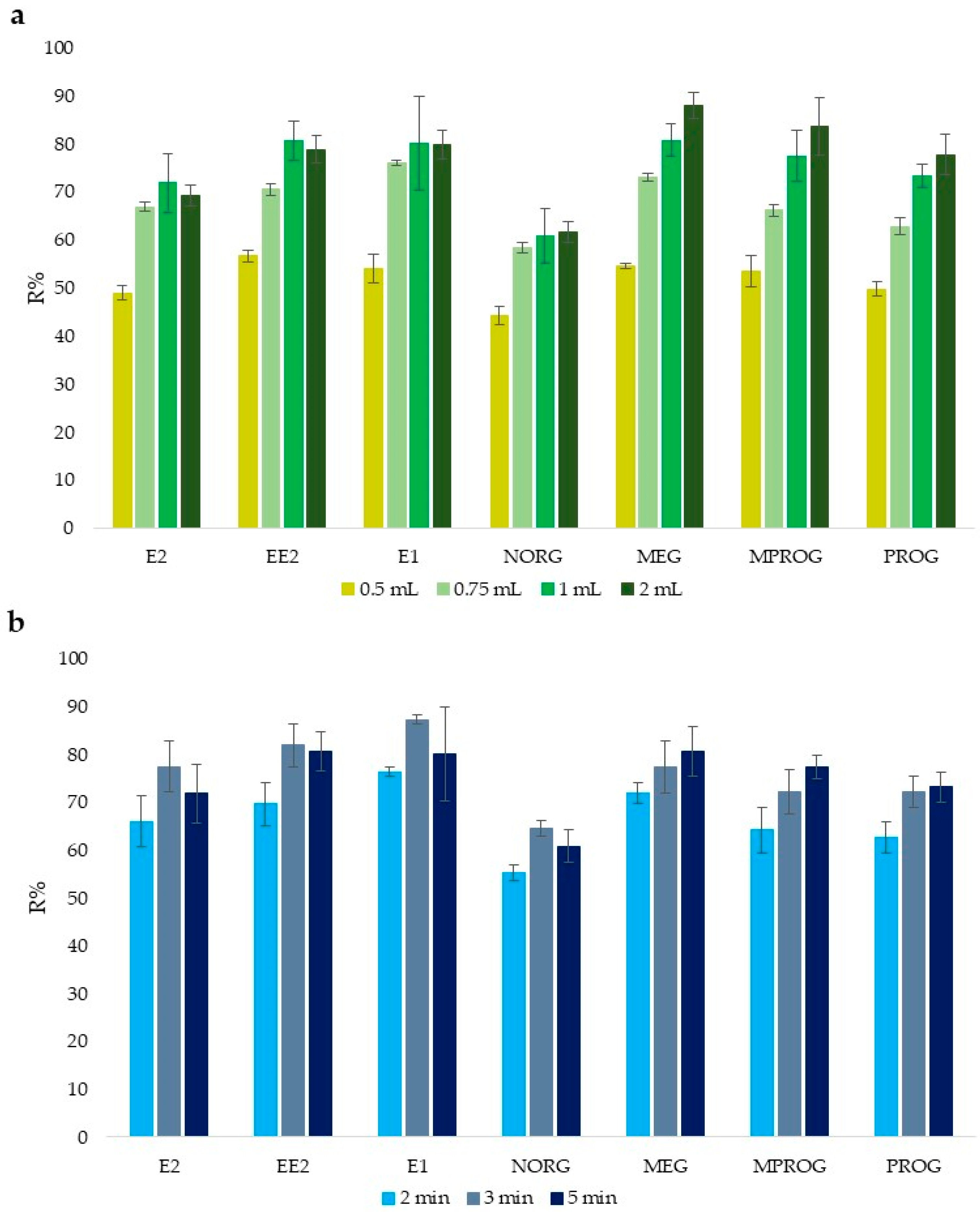 - Dmitrieva, E.; Temerdashev, A.; Azaryan, A.; Gashimova, E. Quantification of Steroid Hormones in Human Urine by DLLME and UHPLC-HRMS Detection. J. Chromatogr. B 2020, 1159, 122390. [Google Scholar] [CrossRef] [PubMed]