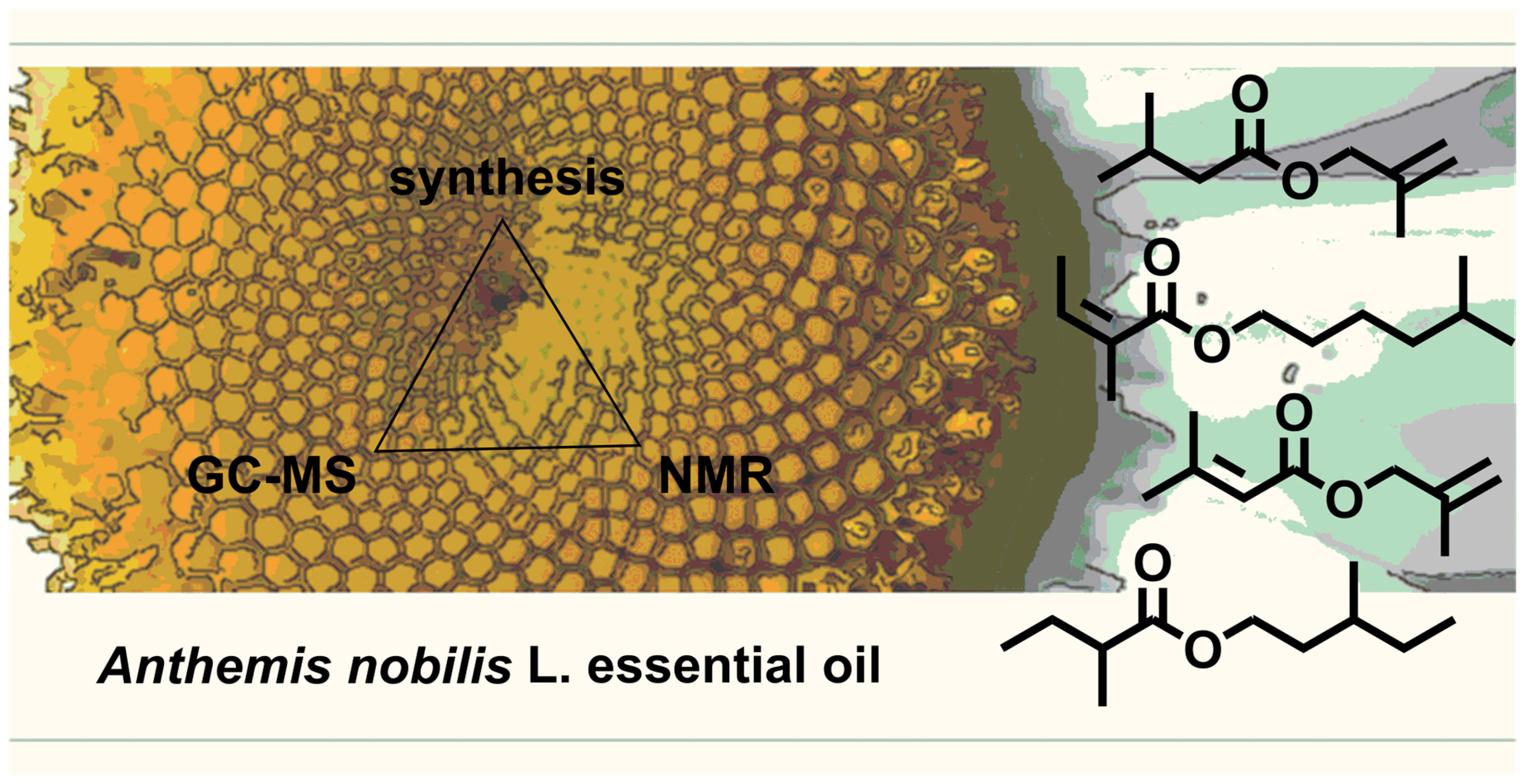 The essential oil (EO) of Roman chamomile is typically obtained from aerial parts of the flowering plant, with fresh flowers yielding approximately 1.0% (w/w) and dried flowers up to 1.6% (w/w) of the oil [3]. Chemical composition of the aerial parts and flowers of Roman chamomile, encompassing both volatile and non-volatile constituents, has been extensively investigated over the past several decades [1,4,5]. Based on available data, it can be estimated that almost 100 different volatiles were found in the EO of Roman chamomile, predominantly by hemiterpenoid acid esters (angelates/tiglates/senecioates) alongside monoterpene hydrocarbons/oxygenated monoterpenes, with their identification predominantly achieved using gas chromatography–mass spectrometry [4]. However, regrettably, some of these compounds were undoubtedly misidentified. For example, Farkas et al. (2003) reported the identification of butyl angelate and butyl tiglate, with a difference in their retention indices of only 2 RI units (1091 and 1093, respectively), which raises serious doubts about the reliability of these identifications [6]. Generally, in the literature, the difference in retention indices (RI) between angelate and tiglate esters, when the alcohol moiety is the same, is approximately 50 units [7]. While the RI value reported for butyl angelate (RI = 1091 [6]) is consistent with literature data [8], the value reported for butyl tiglate (RI = 1093) deviates significantly from the expected literature value for this compound on the same GC column (RI = 1136 [9]). This discrepancy strongly suggests a misidentification. Work by Filipović et al. [3] regrettably suffers from similar inaccuracies (they identified isoamyl angelate at RI = 1143 and isoamyl tiglate at RI = 1148). Additionally, ten years ago, Tadrent et al. (2016) reported the identification of vinyl 2,2-dimethylbutanoate and glycidyl methacrylate as major constituents of the essential oil, accounting for relative abundances of 24.2% and 9.9%, respectively [10]. However, the accuracy of these identifications is highly questionable, and we believe that they most likely represent either a contaminant or a misidentification. Furthermore, certain EO constituents, particularly those with possible structural isomers that have similar retention index values and nearly indistinguishable mass-spectral fragmentation patterns (e.g., the cases of propyl methacrylate, isobutyl isovalerate, 2-butenyl angelate, and detected tiglate of C6 saturated alcohols), were reported to be only tentatively identified in the studies of Antonelli and Fabbri (1998) or Bicchi et al. (1987) [11,12]. Definitive structural elucidation of such compounds requires their isolation or the application of complementary identification techniques, such as chemical synthesis followed by gas chromatographic co-injection experiments. Their identification remains relevant from both phytochemical and commercial perspectives, as it contributes to a deeper understanding of the plant’s aromatic profile and its potential applications in flavor and fragrance industries, as well as, pharmacy.